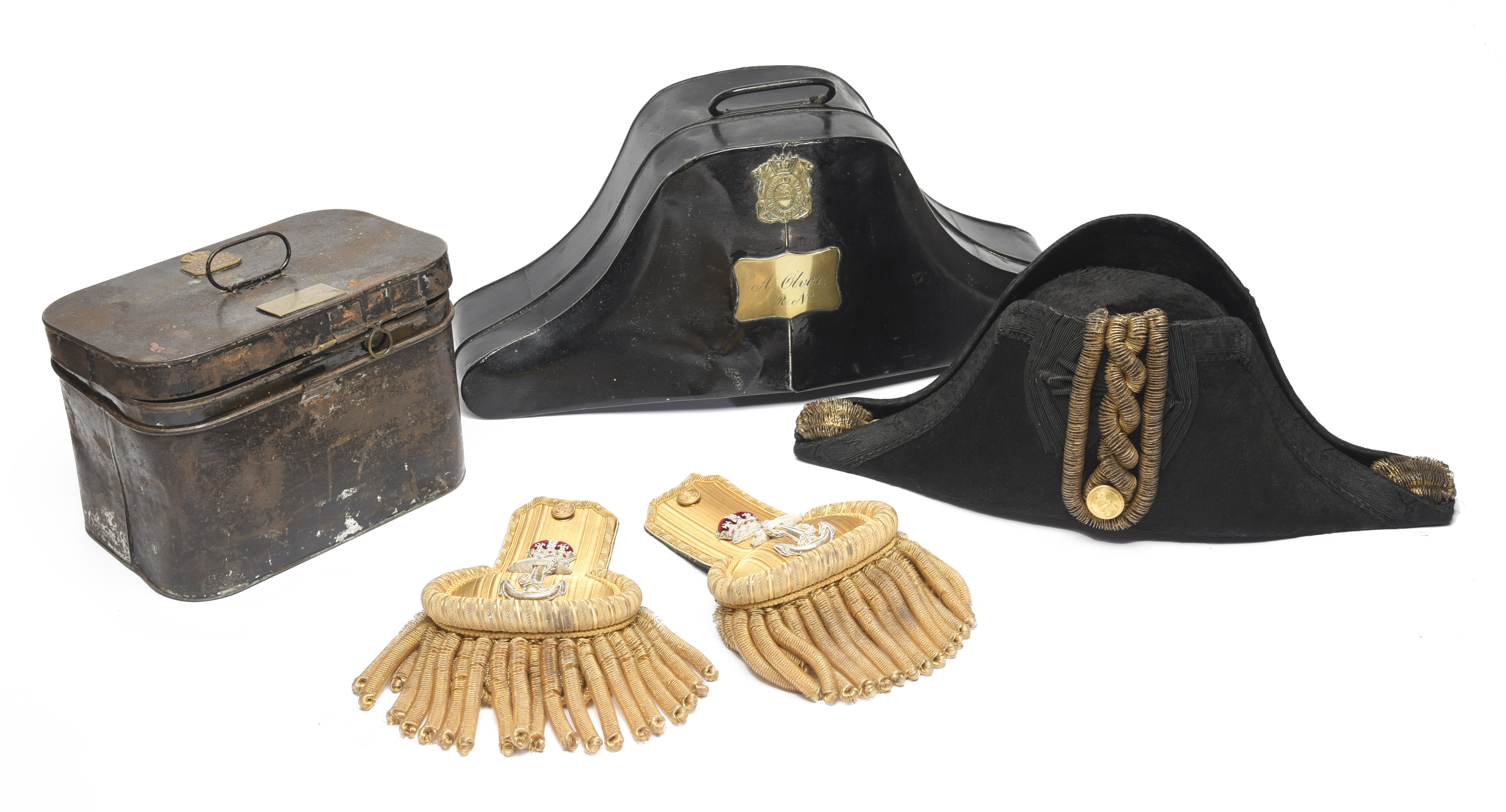 A British Royal Naval officer's sword and uniform items partly attributable to N. H. Harris, R.N.: the sword of regulation type with solid 'gothic' hilt, the folding inner guard engraved with the owner's name, lion head pommel and chequered back strap, brass mounted leather scabbard; a pair of Captain's bullion epaulettes, by Larcom & Veysey, in maker's tin box with owner's name to a brass label on the lid; and a bicorn hat, also by Larcom & Veysey but in an associated tin by E.H. Littleton with another officer' name (A. Olver) to a brass label. [3]