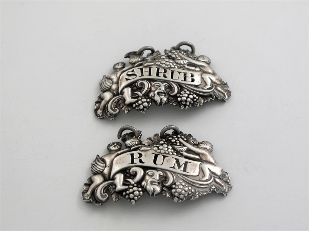 A pair of George III cast bacchanalian wine labels, pierced "SHRUB" & "RUM", by T. Phipps & E. Robinson, London 1809. (2)
