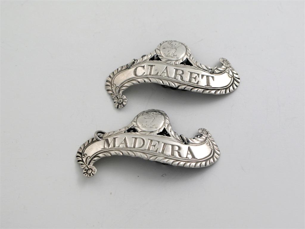 A pair of George III scroll wine labels, with feather-edging, floral terminals and openwork oval surmounts, crested, incised "CLARET" & "MADEIRA", by Hester Bateman, London c.1765 (no date letters). (2)