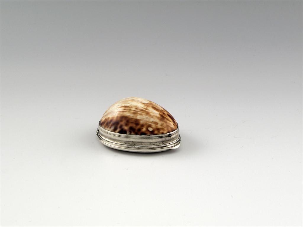 A George III mounted cowrie shell snuff box, engraved on the cover with a rocaille coat of arms, maker's mark only, "IK" unascribed probably Irish/Scottish c.1775, 2.8in (7.2cm) long.