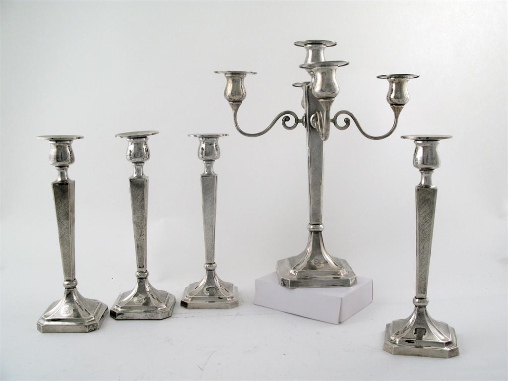 A 20th century Chinese Export five-light candleabrum and four matching candlesticks, on canted square bases with part-hammered decoration each one initialled "S", detachable nozzles, maker's mark "TC" and Chinese character mark, probably for Tuck Chang c.1925, the candleabrum 12in (30.5cm) high. (5)