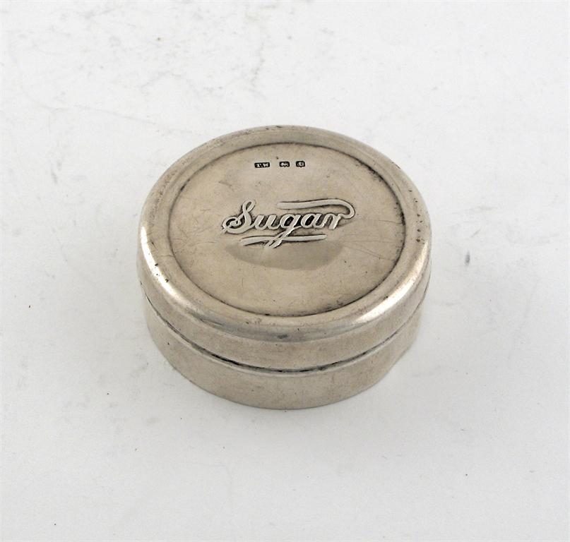 A modern small circular box, with a pull-off cover, stamped "Sugar" maker's mark "TW", Birmingham 1918, 2in (5cm) diameter.