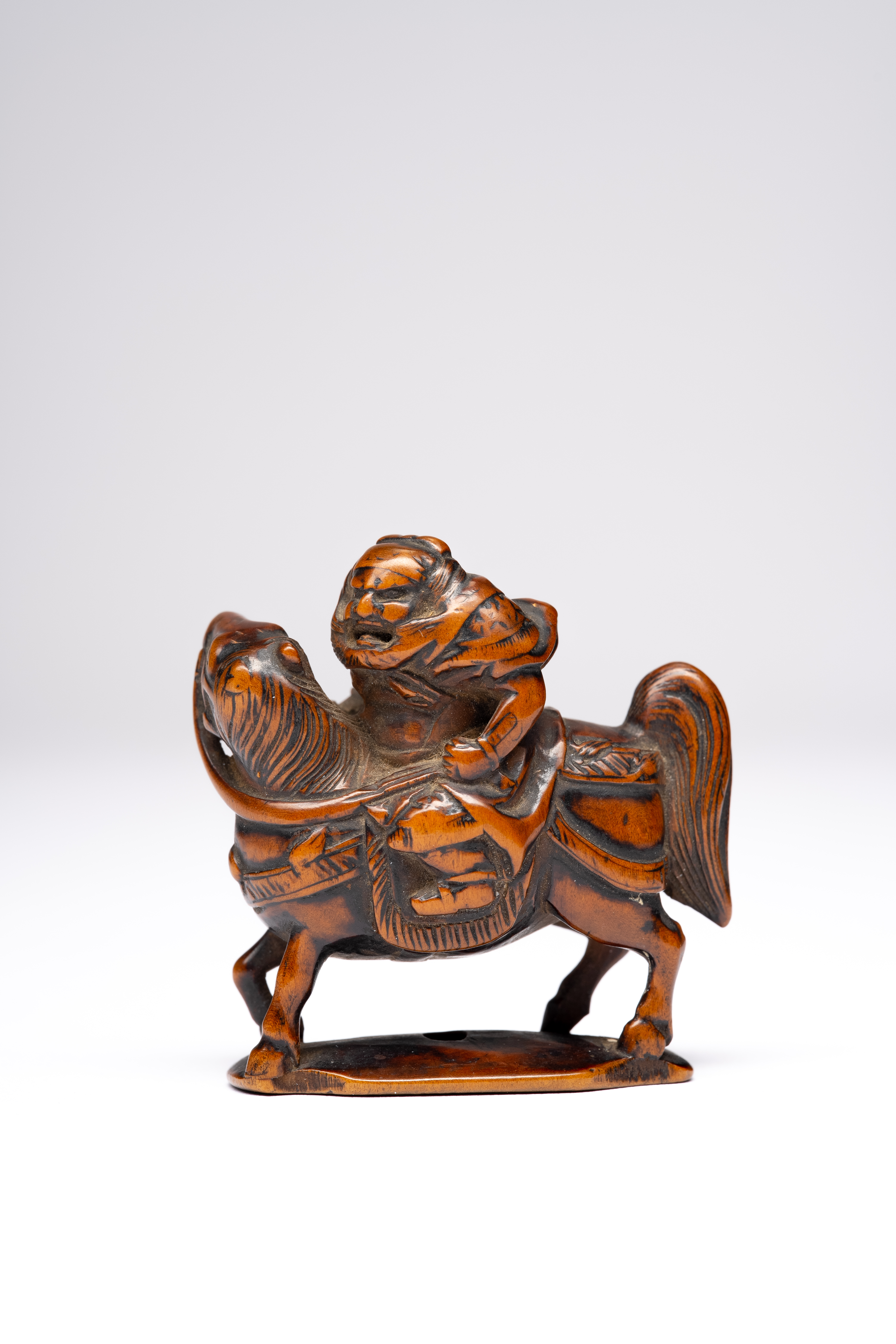 The armour-clad warrior depicted riding his horse Tokiro, his head turned to the left and with a ferocious expression, raised on a flat oval base with a central himotoshi hole, 4.3cm.