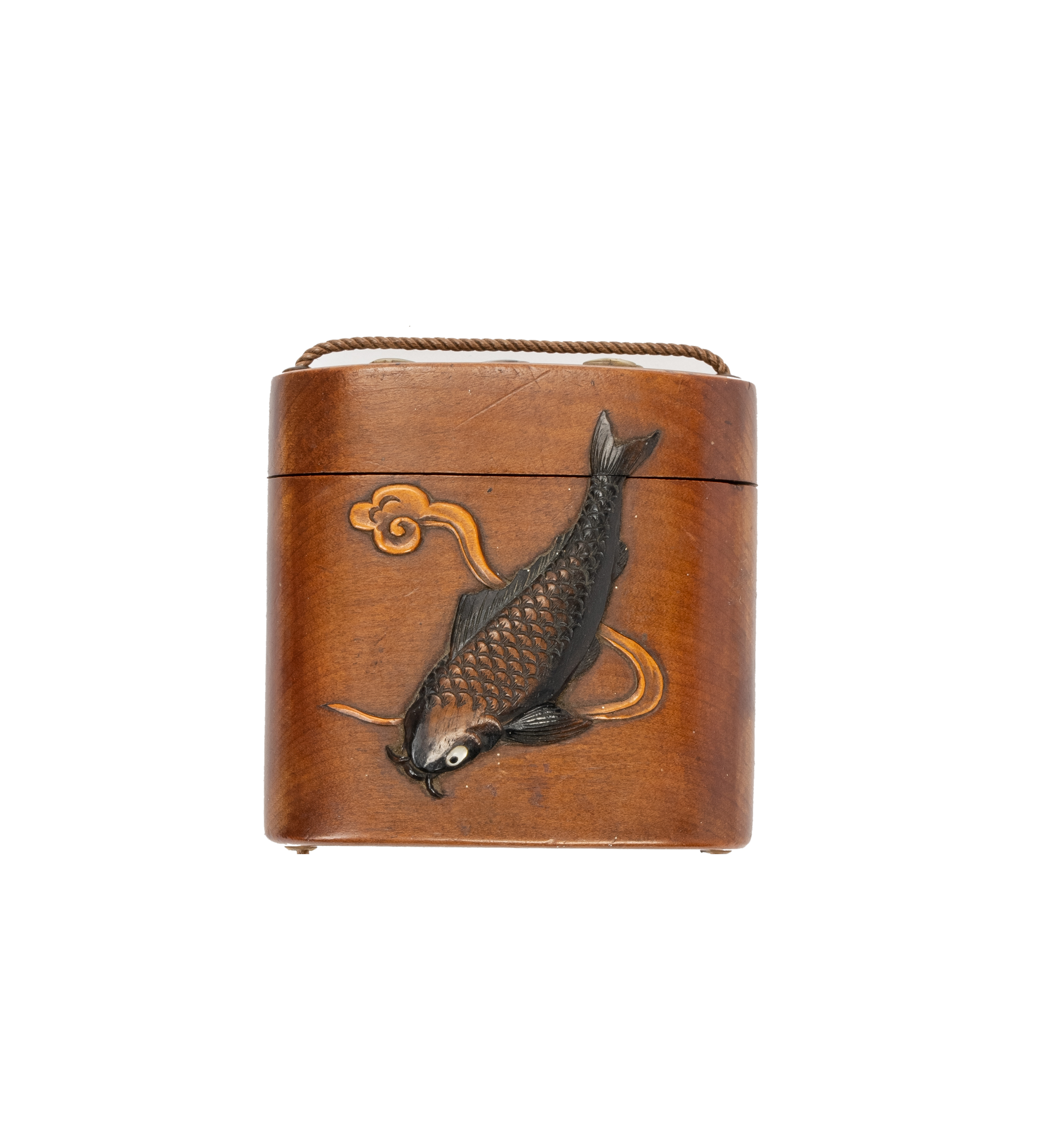 Of rectangular rounded shape, carved to both sides with a large carp amongst swirling waves, their eyes inlaid in mother of pearl, the lid with three seashells also rendered in nacre, 8.5cm.
