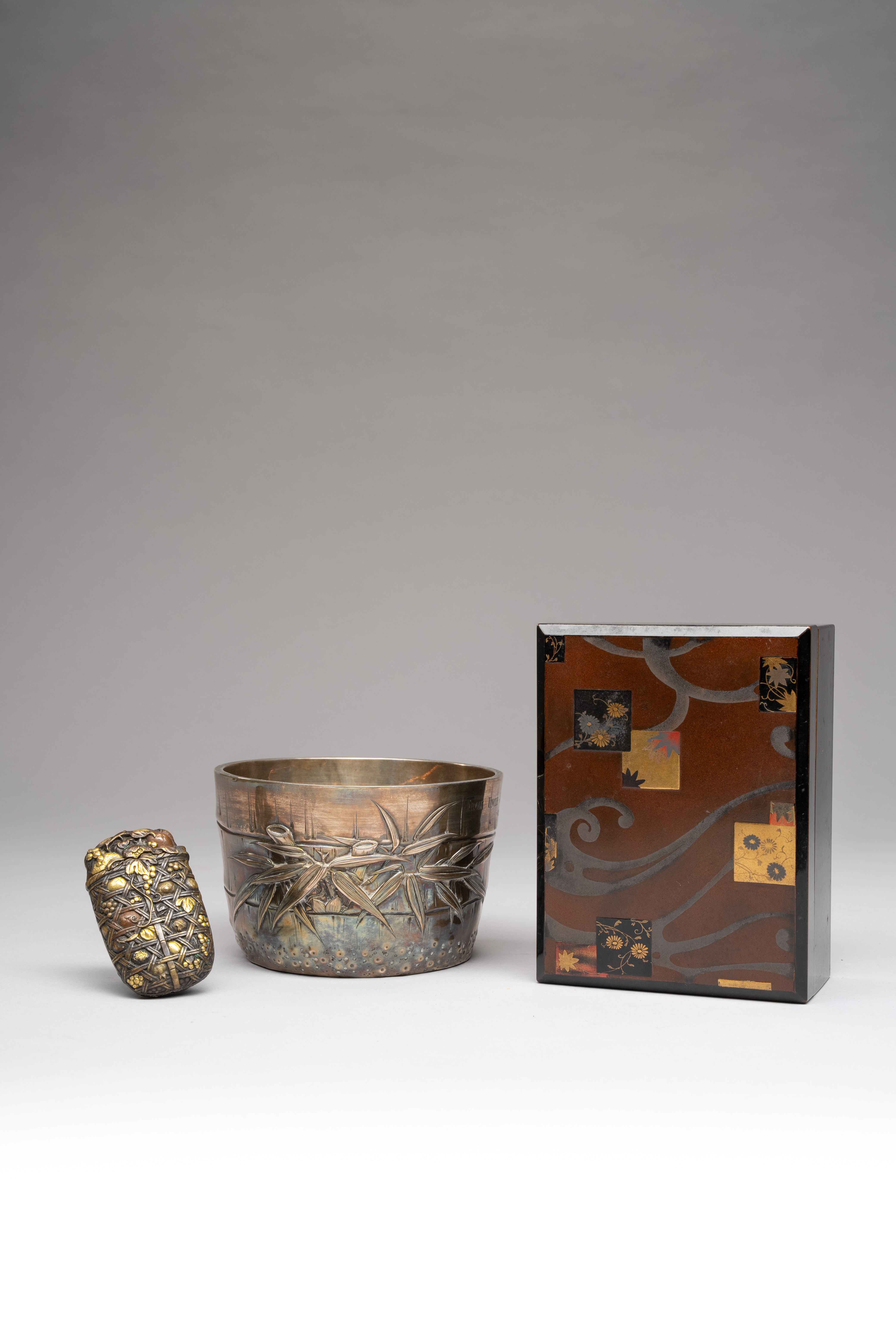 Comprising: a silver bowl shaped as a section of bamboo, with a dedication to the side dated 1920 and marked 'Arthur & Bond Sterling Yokohama' underneath; a rectangular lacquer box and cover decorated with square panels of flowers and leaves scattered over waves; and a soft metal matchbox formed as a basket of fruits, 12.6cm max. (4)