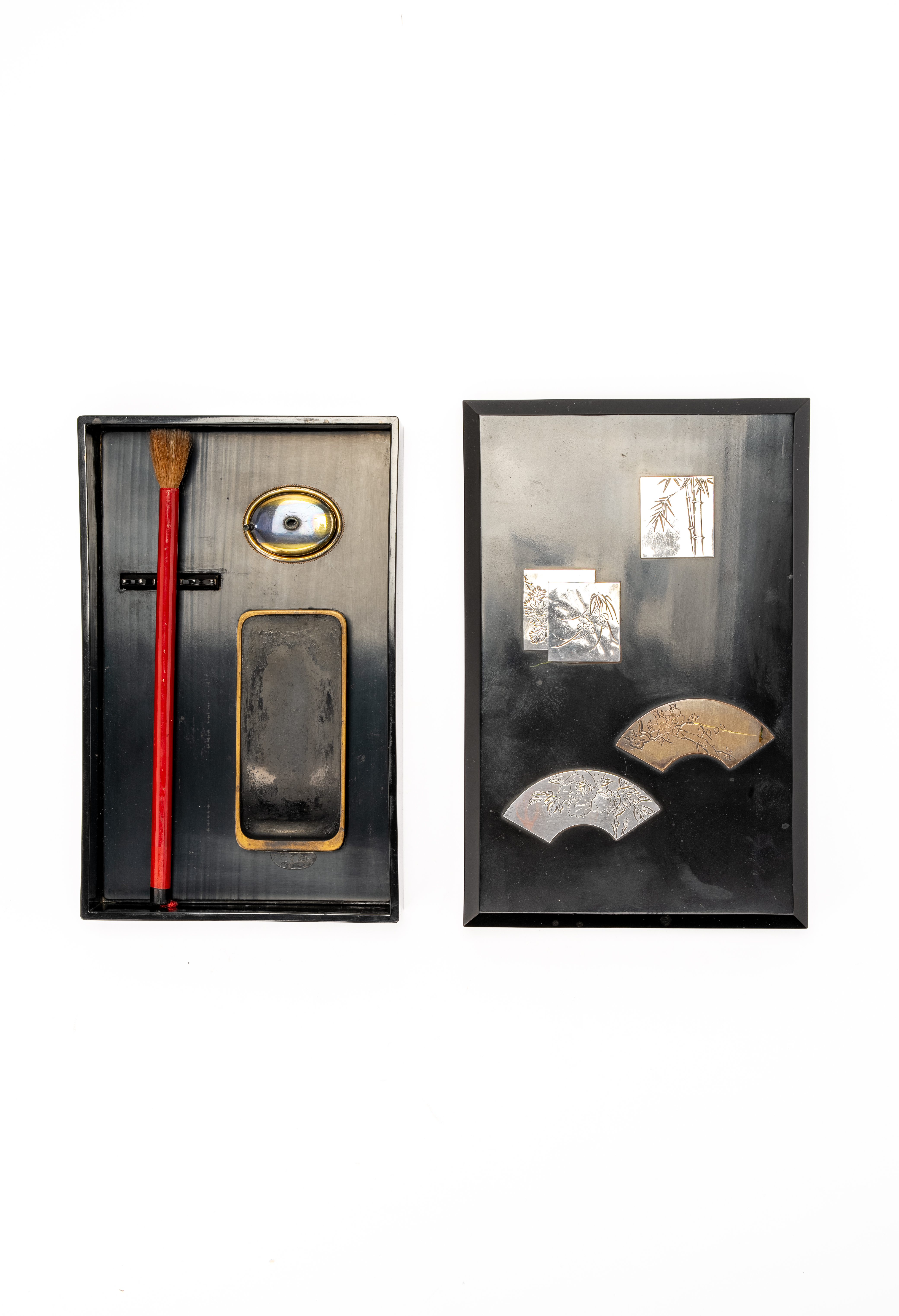 Of typical rectangular shape, the cover decorated with silver-coloured and copper inlays on the black roiro lacquer ground, two fan-shaped and the three others rectangular, embellished with depictions of flowers and bamboo; the inside with a metal suiteki (water dropper), inkstone and brush, 4cm x 15cm x 23.2cm. (5)