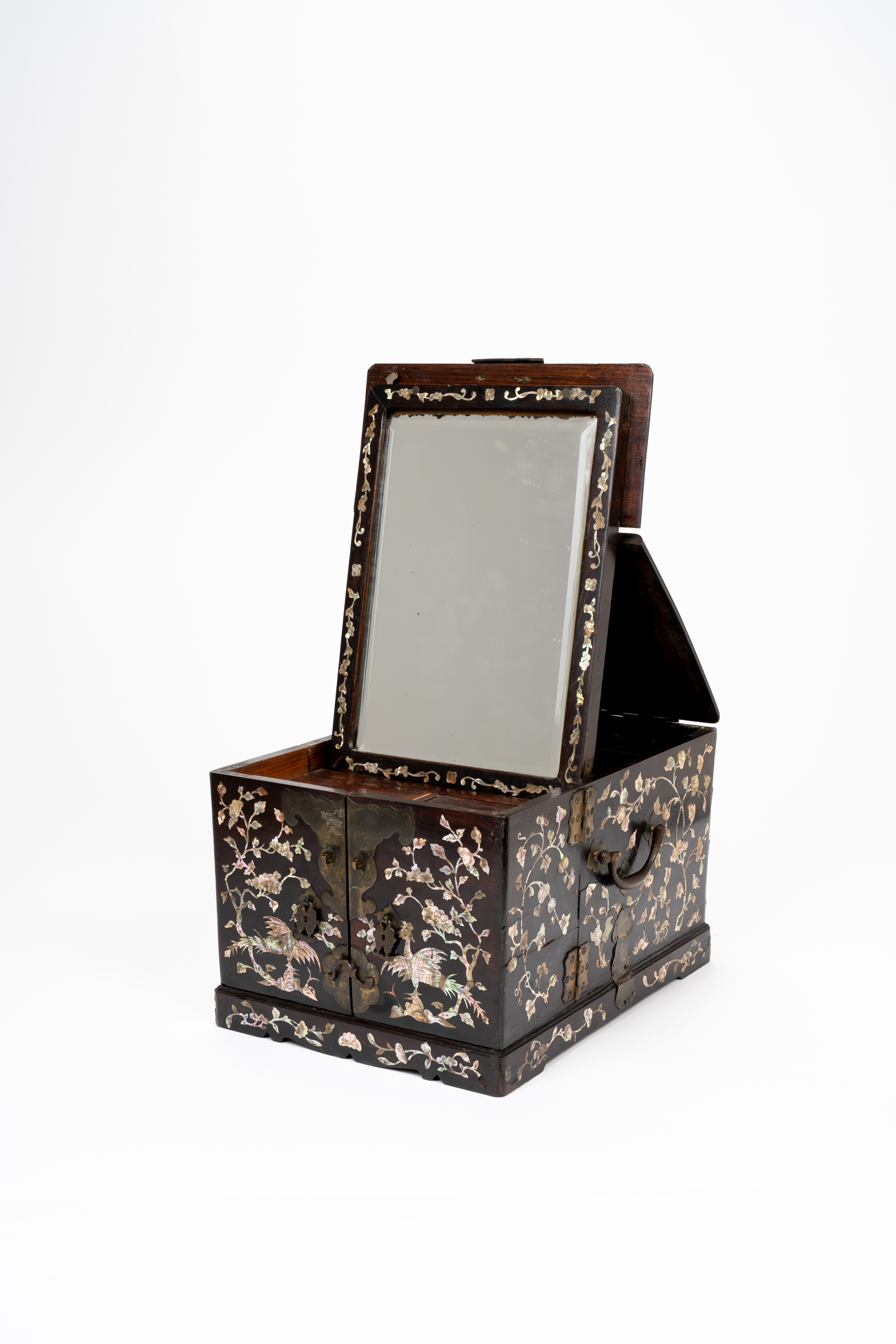 The hinged top lifting to reveal a rectangular mirror, with two front compartments opening outwards revealing an arrangement of drawers within, the exterior with loose ring handles, inlaid in mother of pearl with two phoenix, small animals, birds, bats and a roundel with a figure riding a horse, 21cm x 26cm x 35cm.