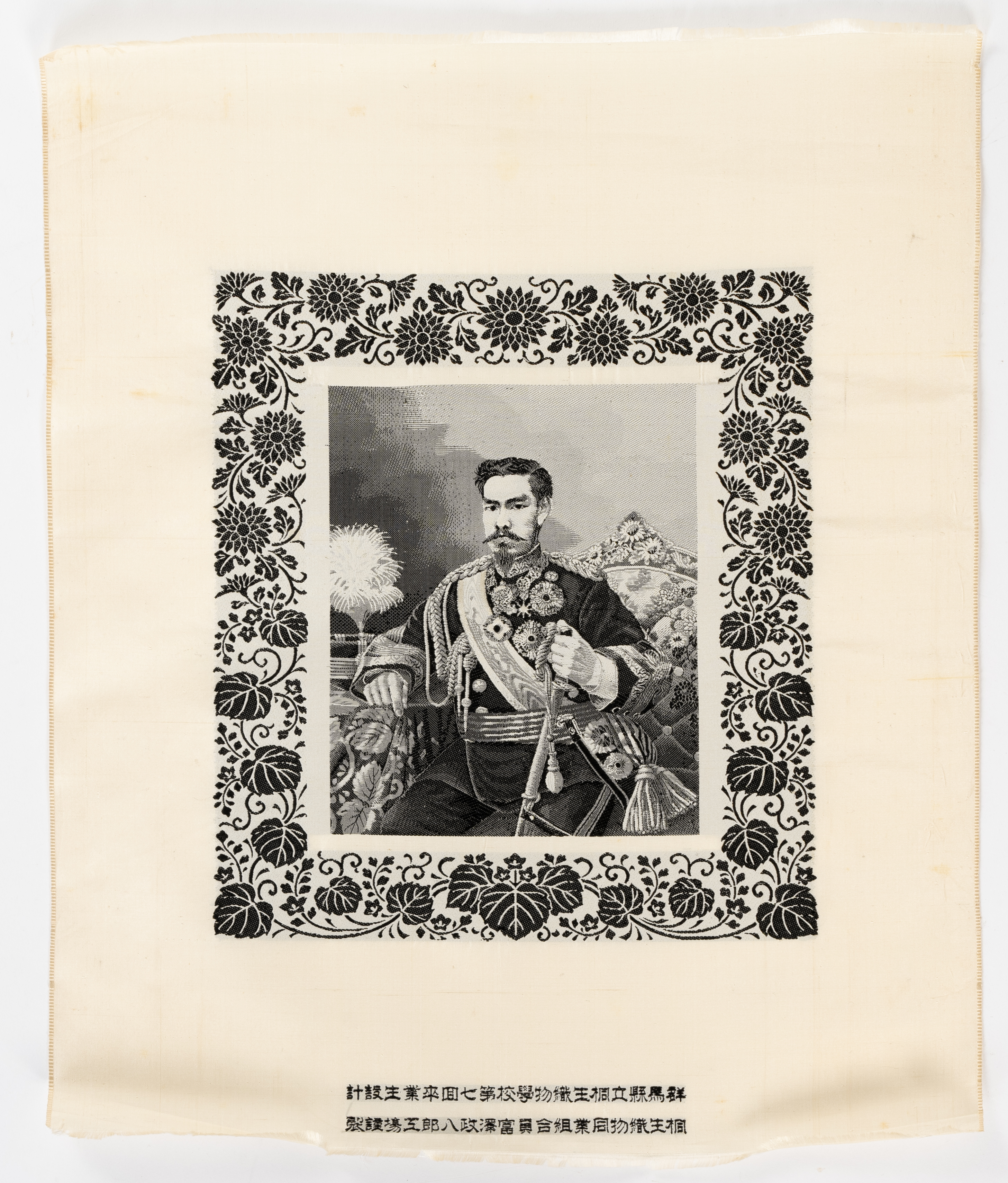 With the official portrait of the sovereign after the drawing by Eduardo Chiossone (1888), depicted seated by a table, his hat with feathered plumes beside him and holding the hilt of his sword; framed by a border of chrysanthemum, paulownia, and leafy tendrils; with two lines of inscriptions below; together with paper ephemera, including two printed Japanese texts, a translation of the ‘Precepts of Iyeyasu’ by K. Wadagaki of the Imperial University and a description of the process of phototexture signed ‘Tomizawa Phototexture Department’; the silk panel pasted to a paper scroll mount, 37cm x 30cm. (5)