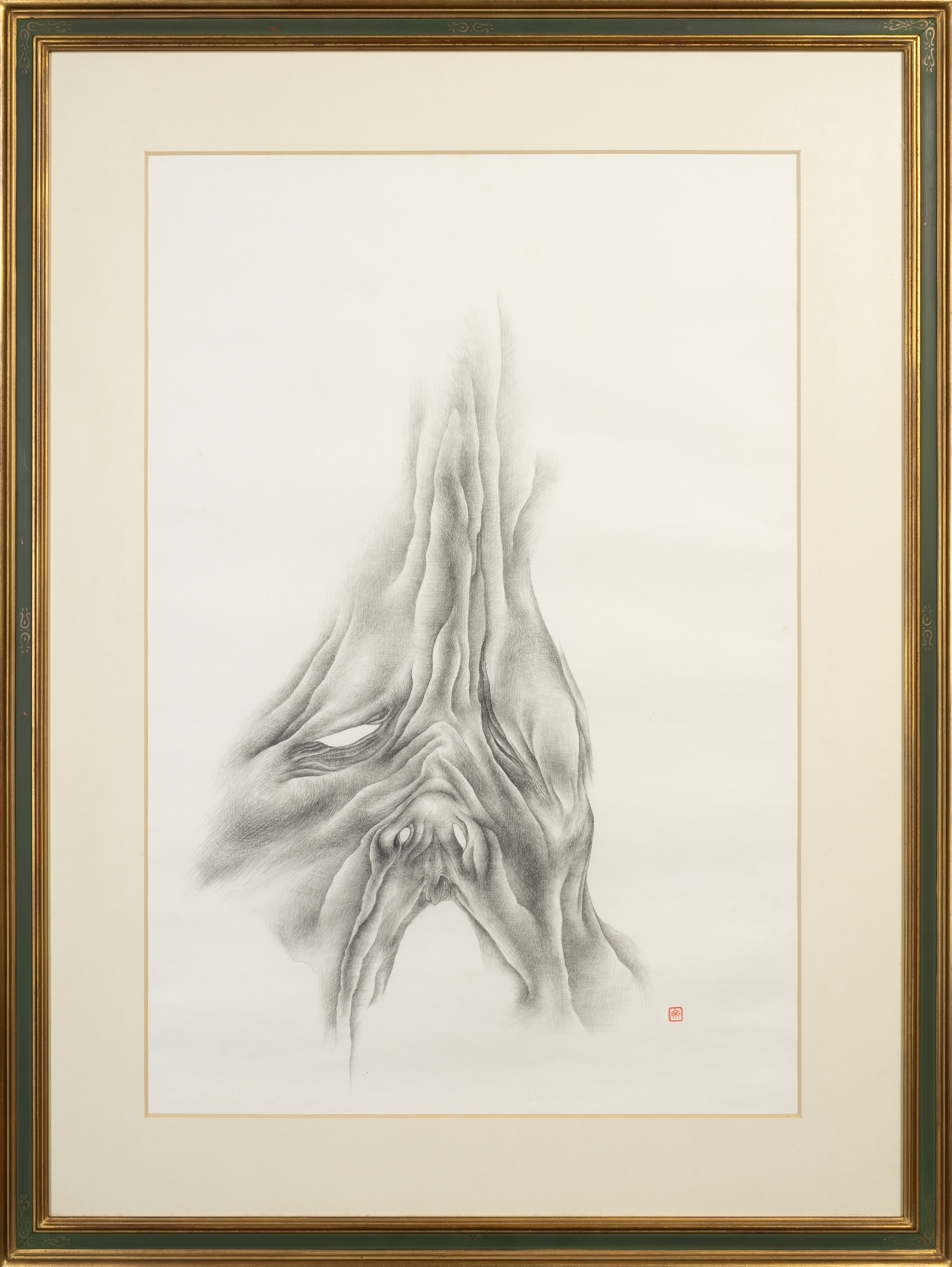 A Japanese drawing, pencil on paper, depicting the upper half of a grimacing face, the hauntingly distorted features resembling a gnarled tree trunk, sealed, framed and glazed, with a label to the back dating the work to the month of February, Showa 57 (1982), 64cm x 44cm.