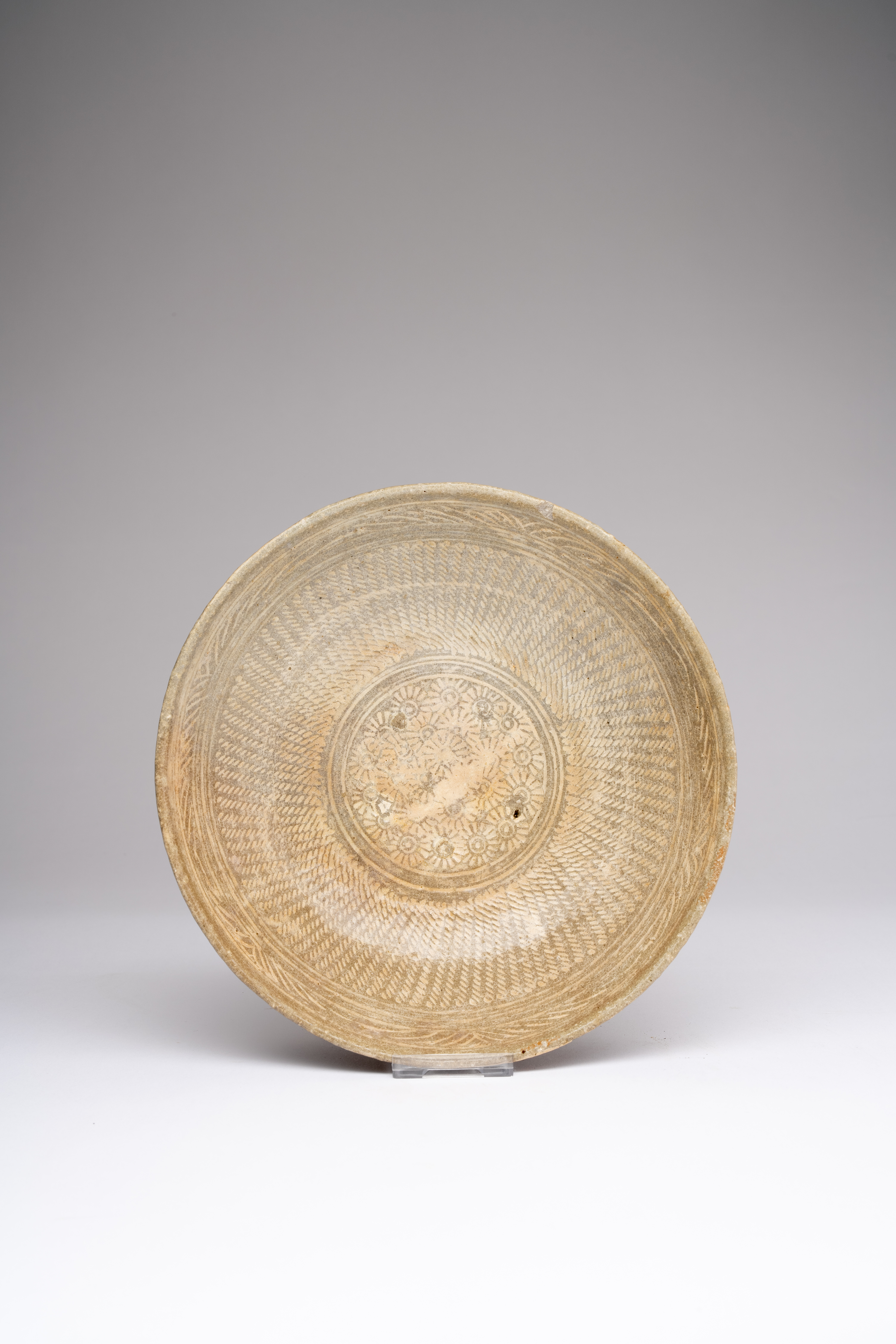 The wide body raised on a short foot, the grey stoneware decorated to the well with a medallion enclosing many flowerheads, encircled by a band of rope-like patterns and a border of stylised grass designs, the reverse with similar decoration, 20.2cm.