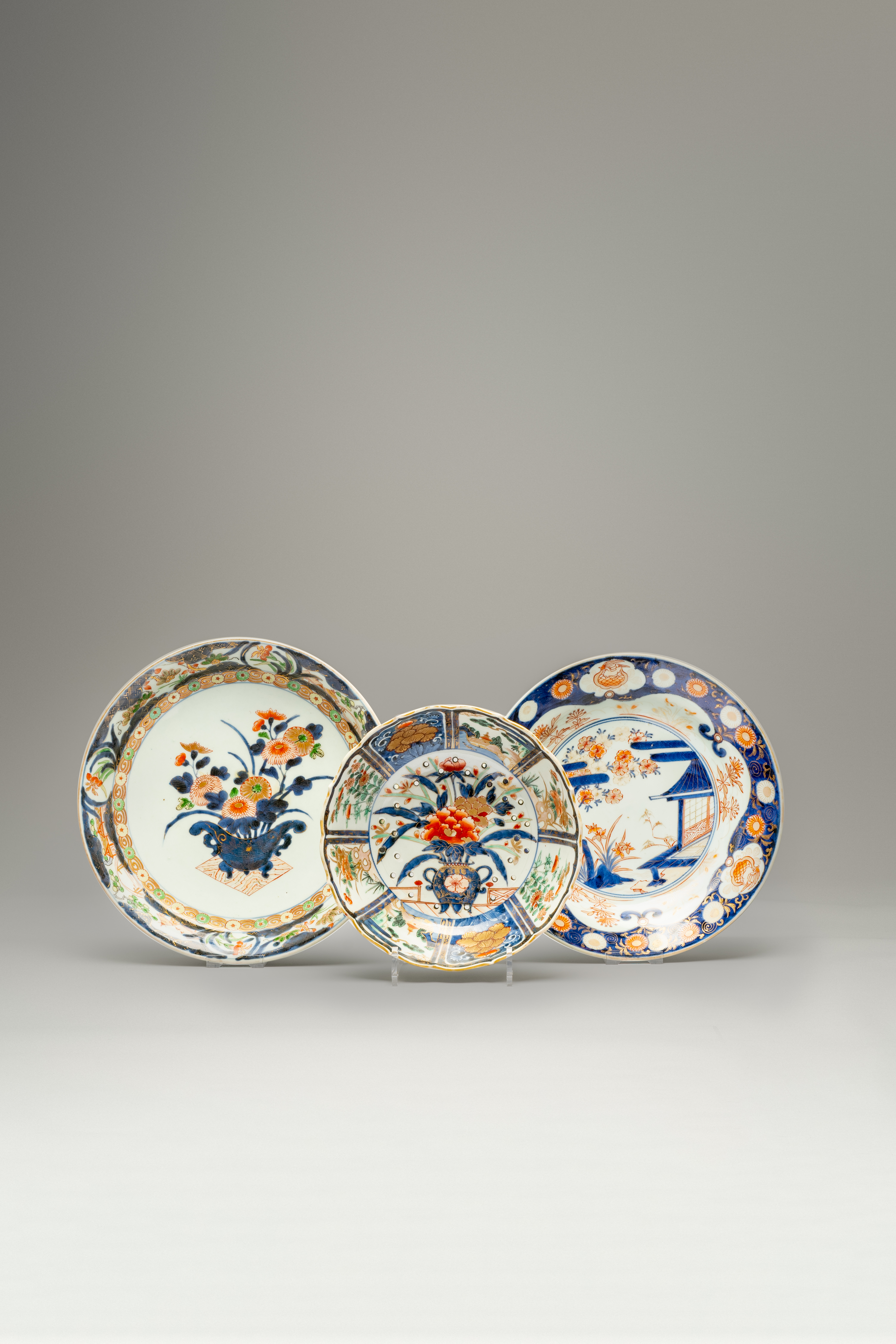 AN UNUSUAL JAPANESE PORCELAIN STRAINER AND TWO IMARI DISHES EDO PERIOD