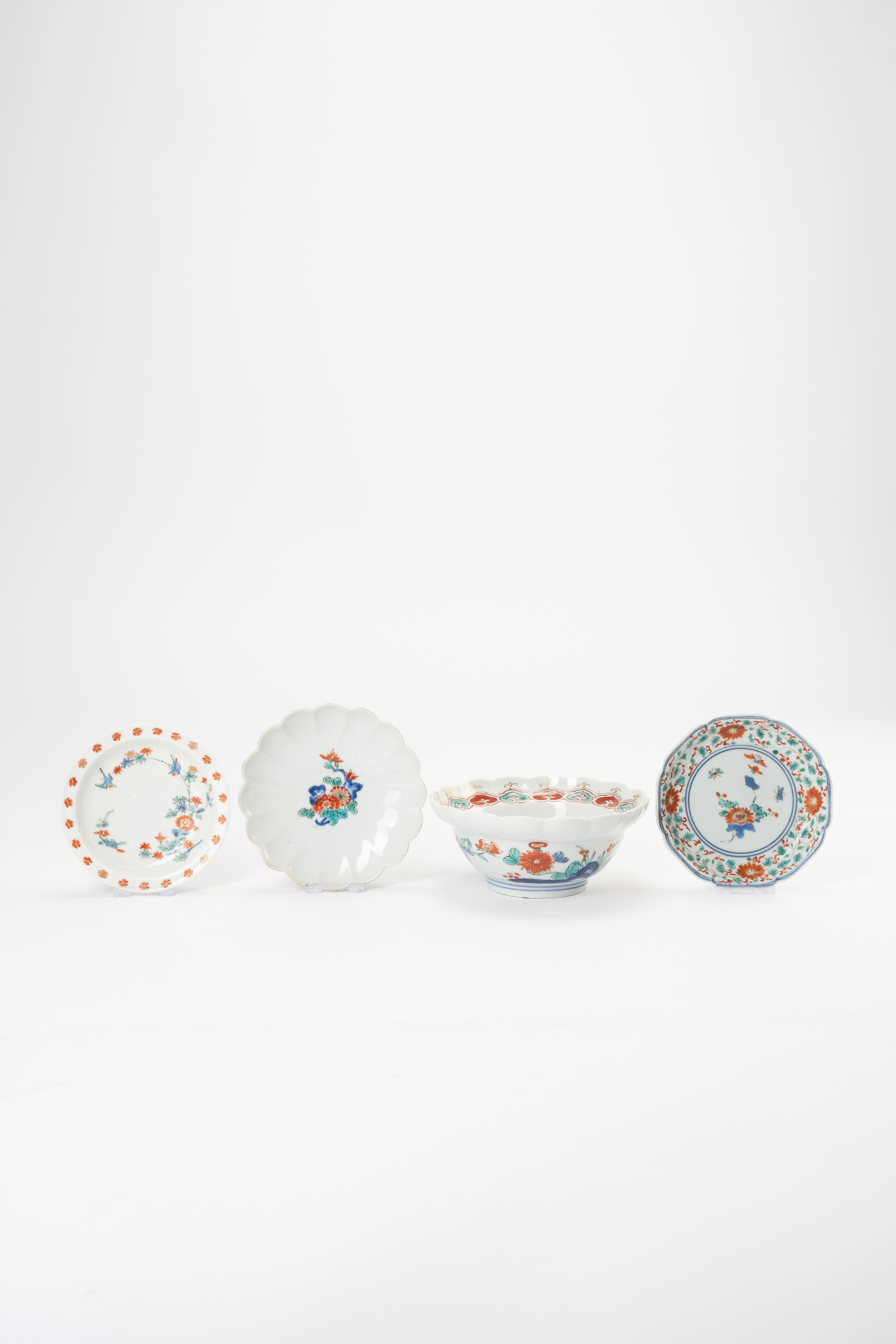 The bowl and possibly associated cover both with a scalloped rim, decorated in underglaze blue, gilt and polychrome enamels with flowering sprays of chrysanthemum and reishi heads; one dish with a foliate body and painted with further blooms, and the other dish with two small birds, bamboo and peonies, the rim with prunus blossoms, 15.6cm max. (4)