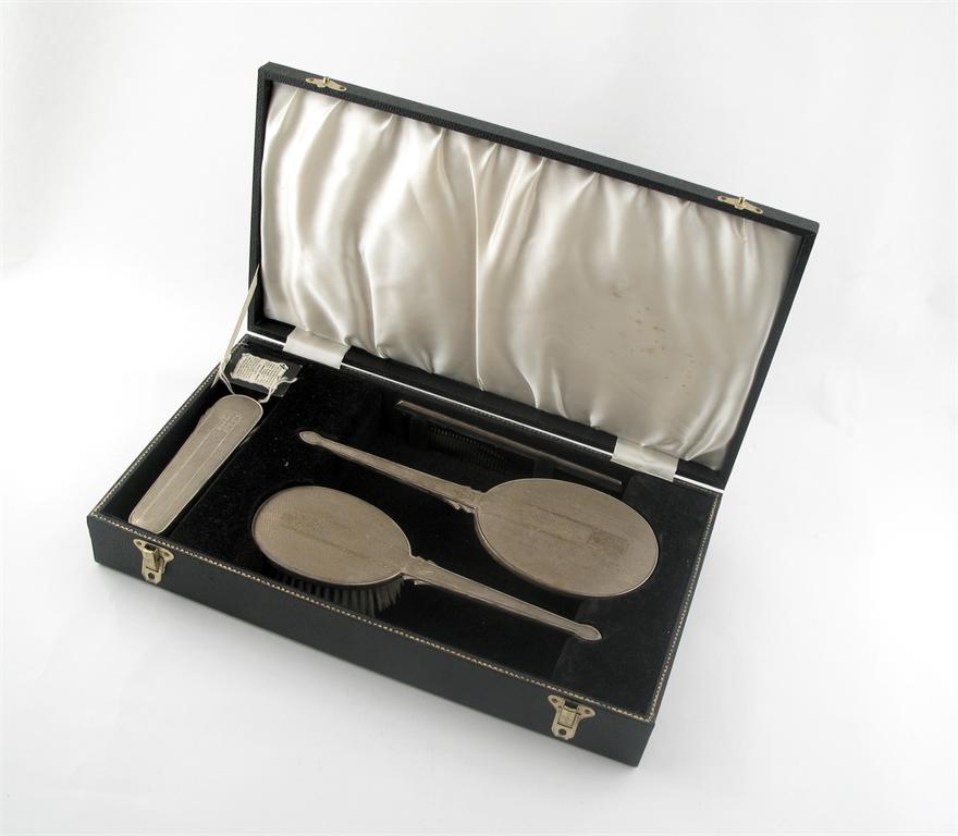 A modern cased toilet set, with engine-turned decoration comprising hand mirror, hair brush, clothes brush and mounted comb.