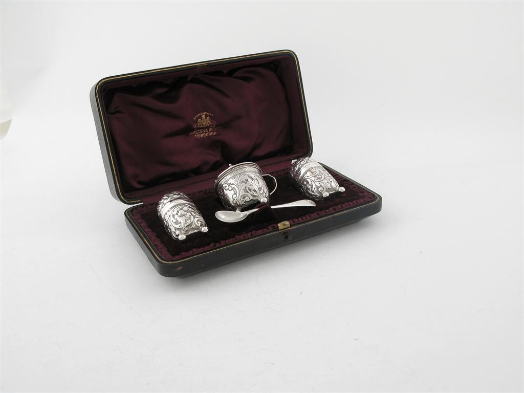 A late Victorian mustard pot and Edwardian peppers set of similar design, each piece embossed with scrolling leaves and flowers, vacant cartouche, on ball feet, by H. Woodward & Co Ltd, mixed dates, and a non matching spoon, cased. (4)