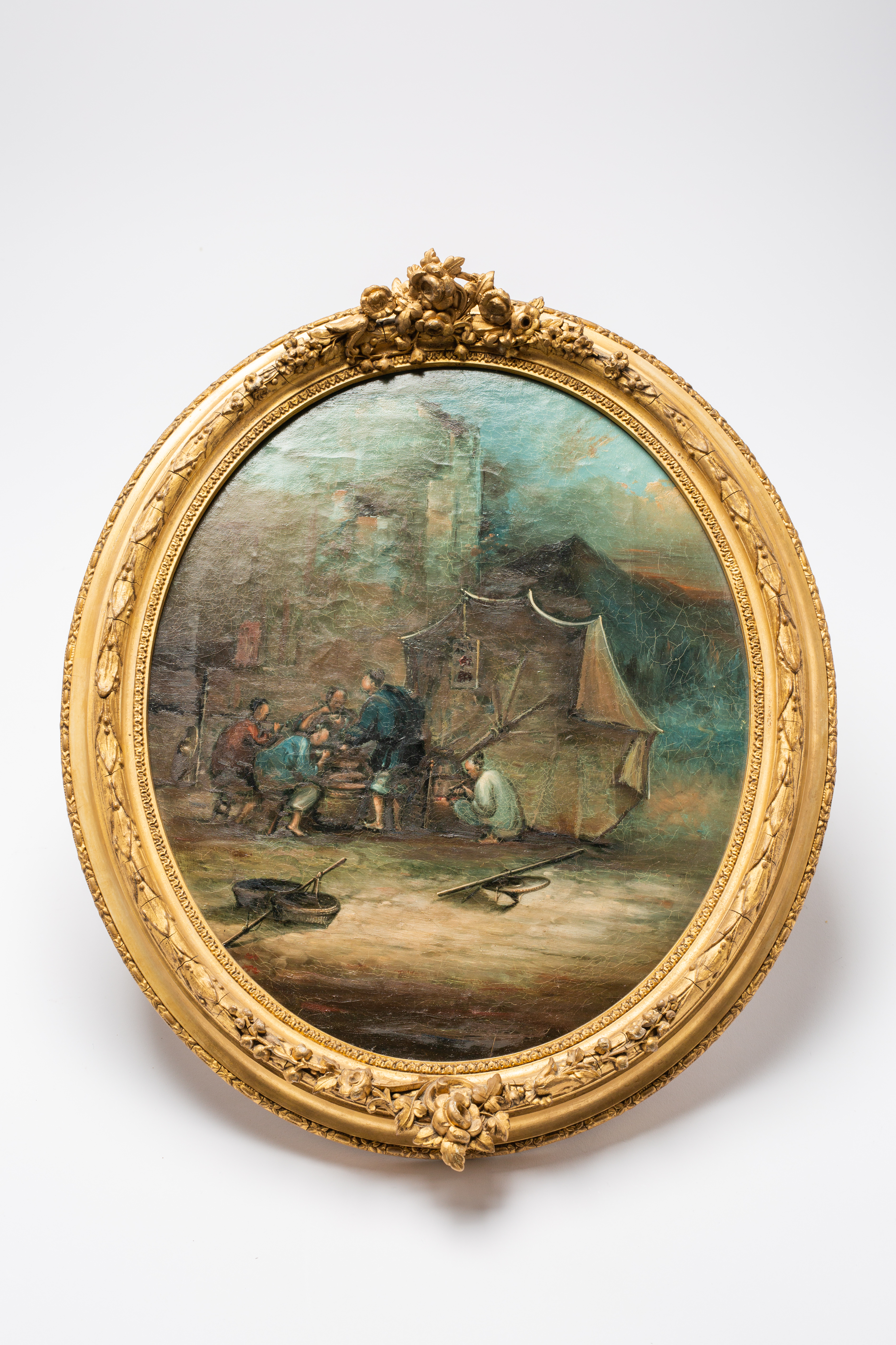 Three oval portraits, one with figures beside a pagoda, another with opium smokers, the third with three women and a baby in a sampan, each with an oval label inscribed: 'Hing Qua marine, ship, portrait and chart painter also Daguerrotype copier, Hong Kong' all with gilt frames, 38cm. (3)