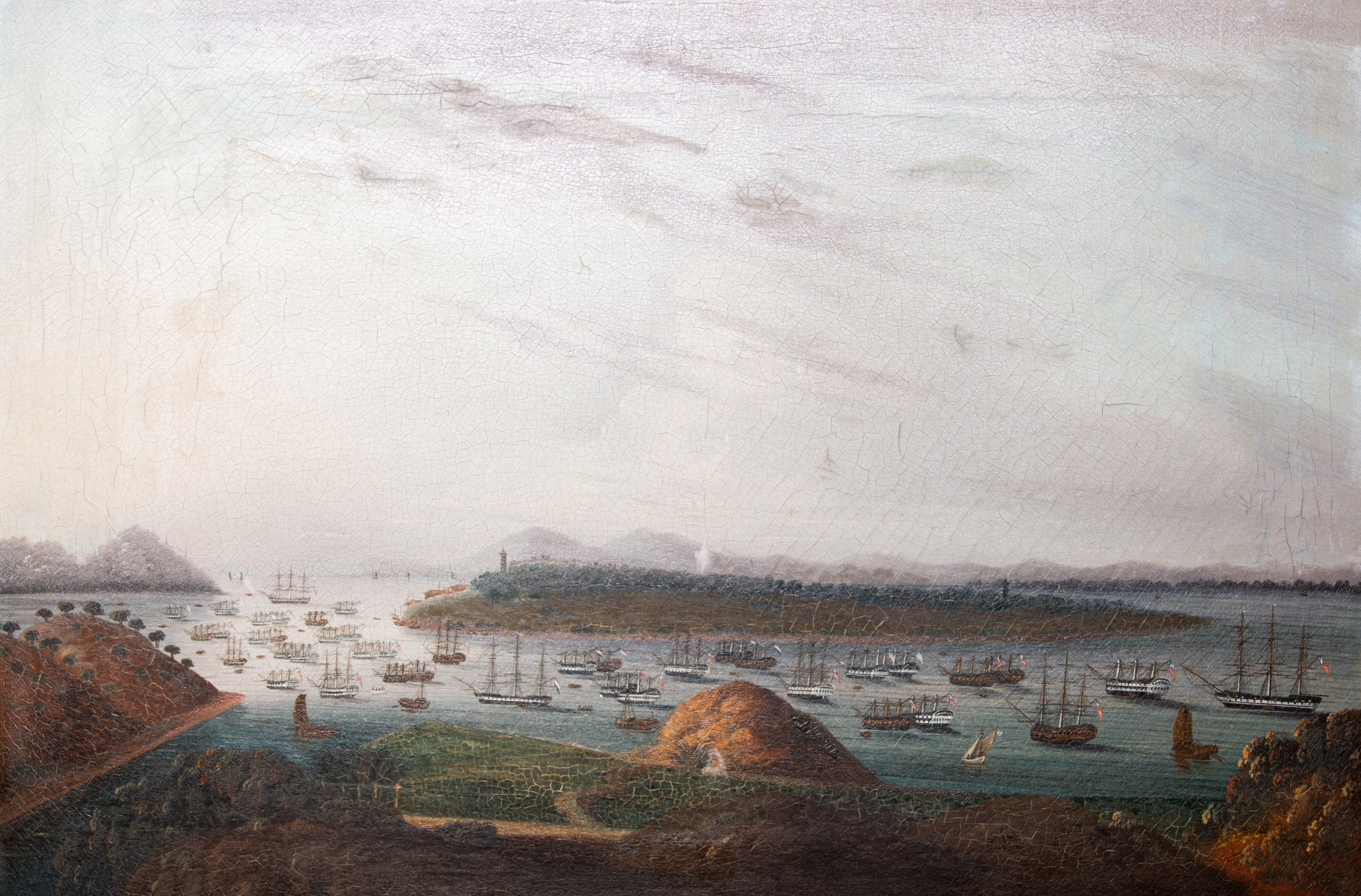 This large and fine view of the anchorage at Whampoa (Huangpu) is taken from a hill overlooking the foreign cemetery on Dane's Island. In the distance is the Whampoa (Pazhou) Pagoda, on Pazhou Island, Haizhu District, Guangzhou, which survives today. The pagoda was a landmark for Western sailors and is featured in many Chinese paintings for the Western market. It was at Whampoa that Western ships were made to anchor in the Pearl River, with only officers continuing on to Canton. American and other foreign ships are at anchor, and the buildings used by foreign traders can be seen in the distance. Chigang pagoda, now surrounded by the southern suburbs of Guangzhou can be seen on the left.