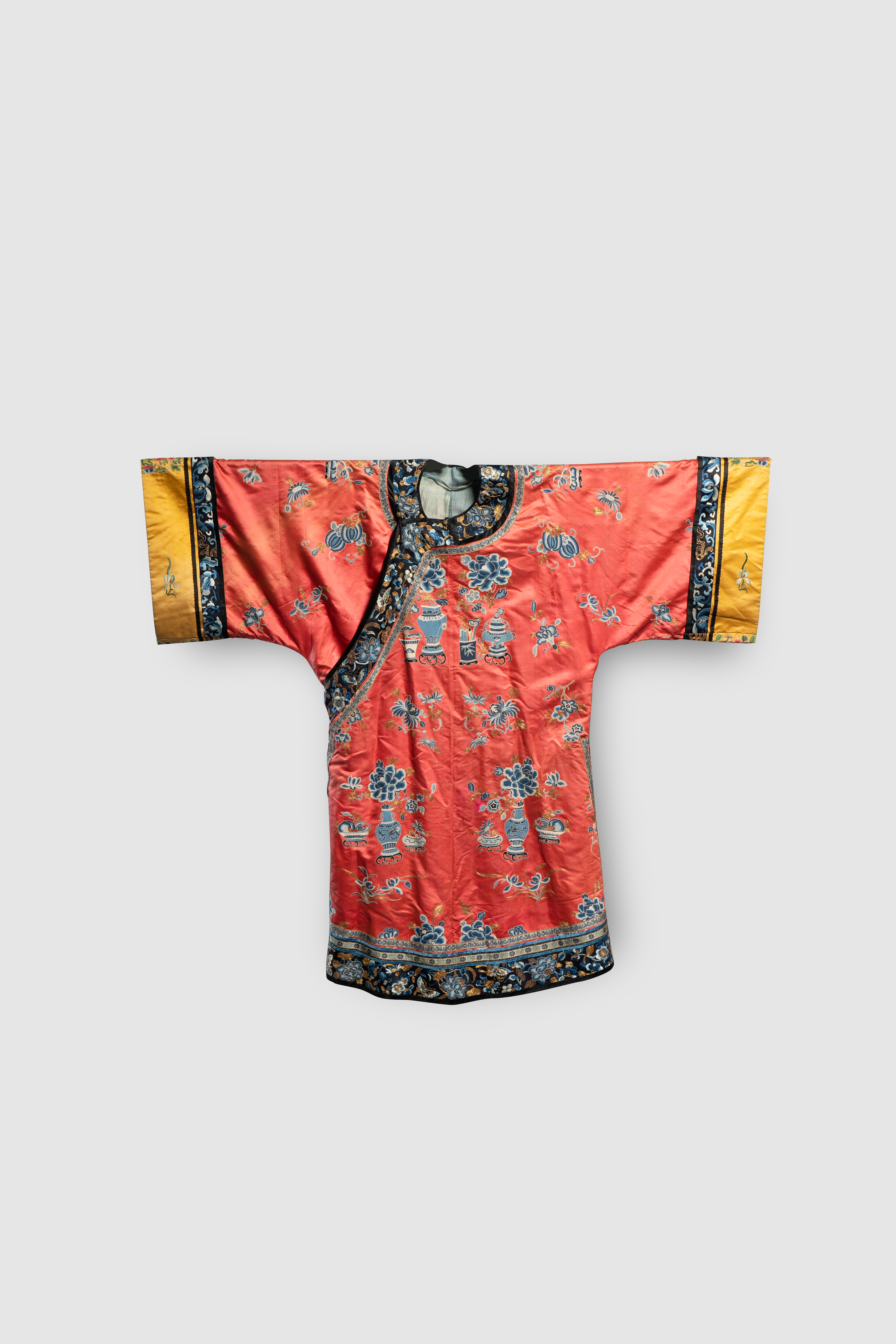 A CHINESE CORAL-GROUND EMBROIDERED SILK ROBE LATE QING DYNASTY