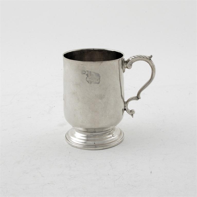 A George III child's mug, on a stepped foot, scrolling handle, probably by James Stamp, London 1778, 3in (8.9cm) high, 4.25oz.