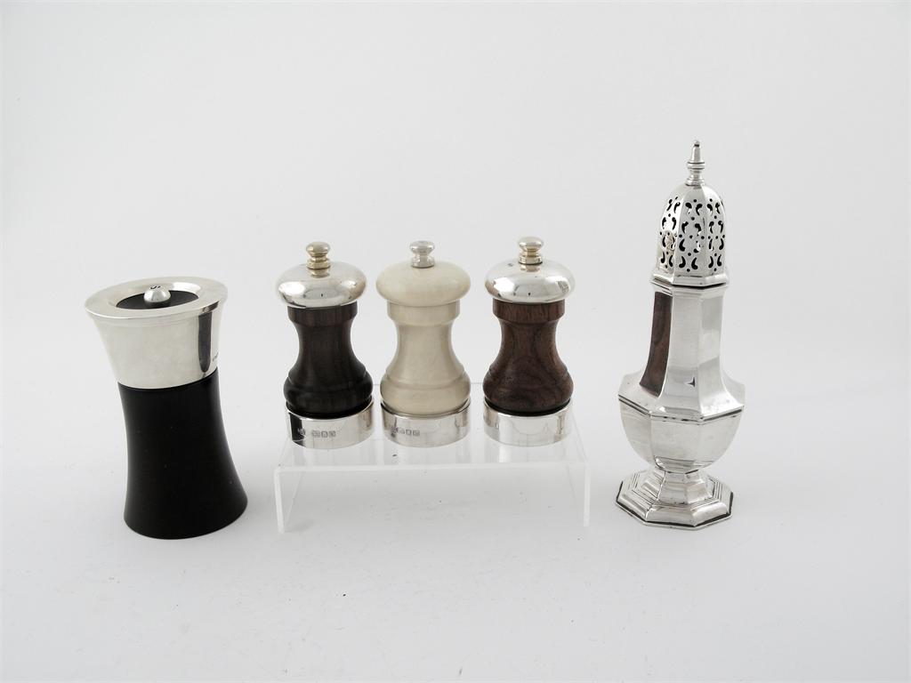 Three modern mounted wooden peppermills, a similar mounted ivory substitute example and a modern octagonal suagr caster, 5.5oz weighable silver. (5)