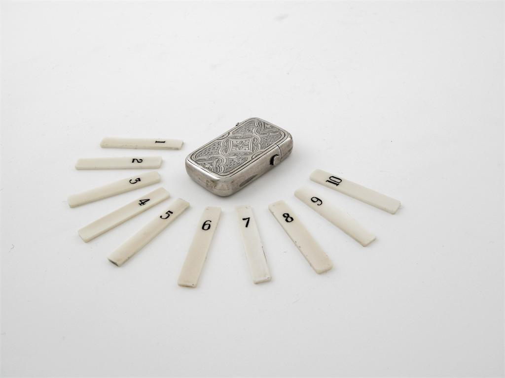 A Victorian engraved butt marker, with an engraved, rounded oblong case, initialled "CMB" and containing ten, numbered ivory place markers (probably later replacements), the case by George Unite, Birmingham 1871, 2.25in (5.7cm) high.