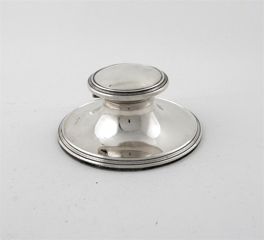 A modern capstan inkwell, with stamped decorative borders, hinged cover and drop in glass liner, by A & J Zimmerman, Birmingham 1927, (loaded), 6in (15cm) diameter.