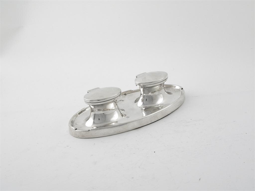 A modern oval inkwell, in the form of a double capston, with two hinged covers and a pen rest, ridge around the border, two glass liners, by A & J. Zimmerman, Birmingham 1932, 8oz (20.3cm) wide.