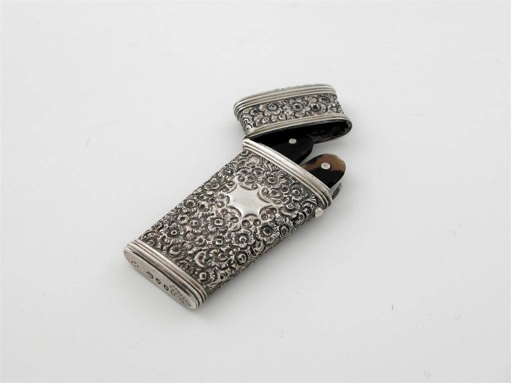A Victorian lancet case, profusely chased with flowers, vacant cartouche and reeded borders, London 1850, containing two tortoiseshell and steel lancets, 2.5in (6.5cm) high.