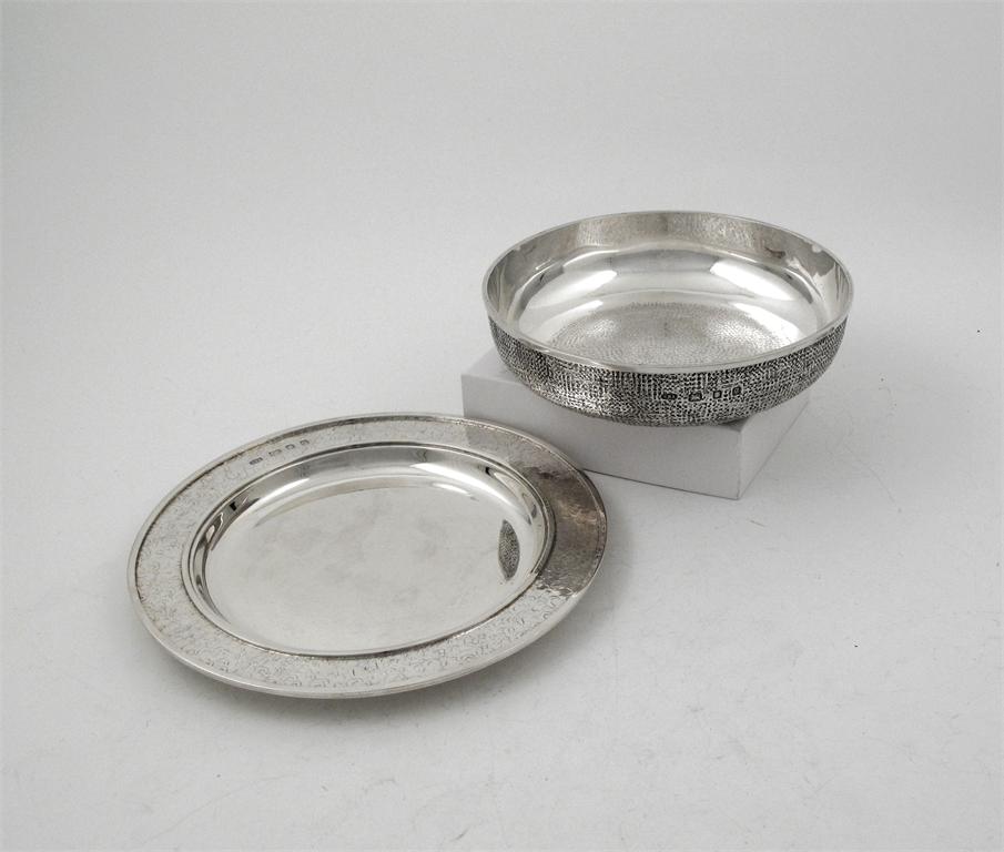 By C.N. Lawrence: a modern shallow circular dish, with a textured centre and textured sides, and a circular side plate with a textured border, London 1971 and 1970 respectively the plate 7.2in (18.2cm) diameter, 19oz. (2)