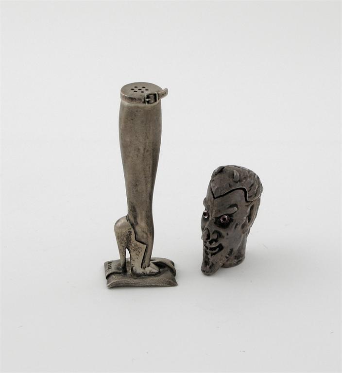 A modern cast novelty pepperette, in the form of a ladies leg on a fabric pad, wearing a high heeled shoe together with a modern vesta case in the form of a satyr's mask, with coloured glass eyes, 5oz. (2)