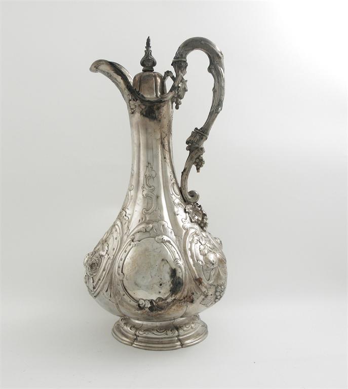 A large Victorian embossed ewer, with a slender neck a hinged cover and an insulated, vine tendril handle, gilt interior, by Messrs Edward & John Barnard, London 1859, 14.2in (36cm) high, 41oz.