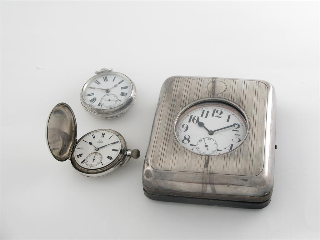A plated large pocket watch, in a mounted stand and two other pocket watches.