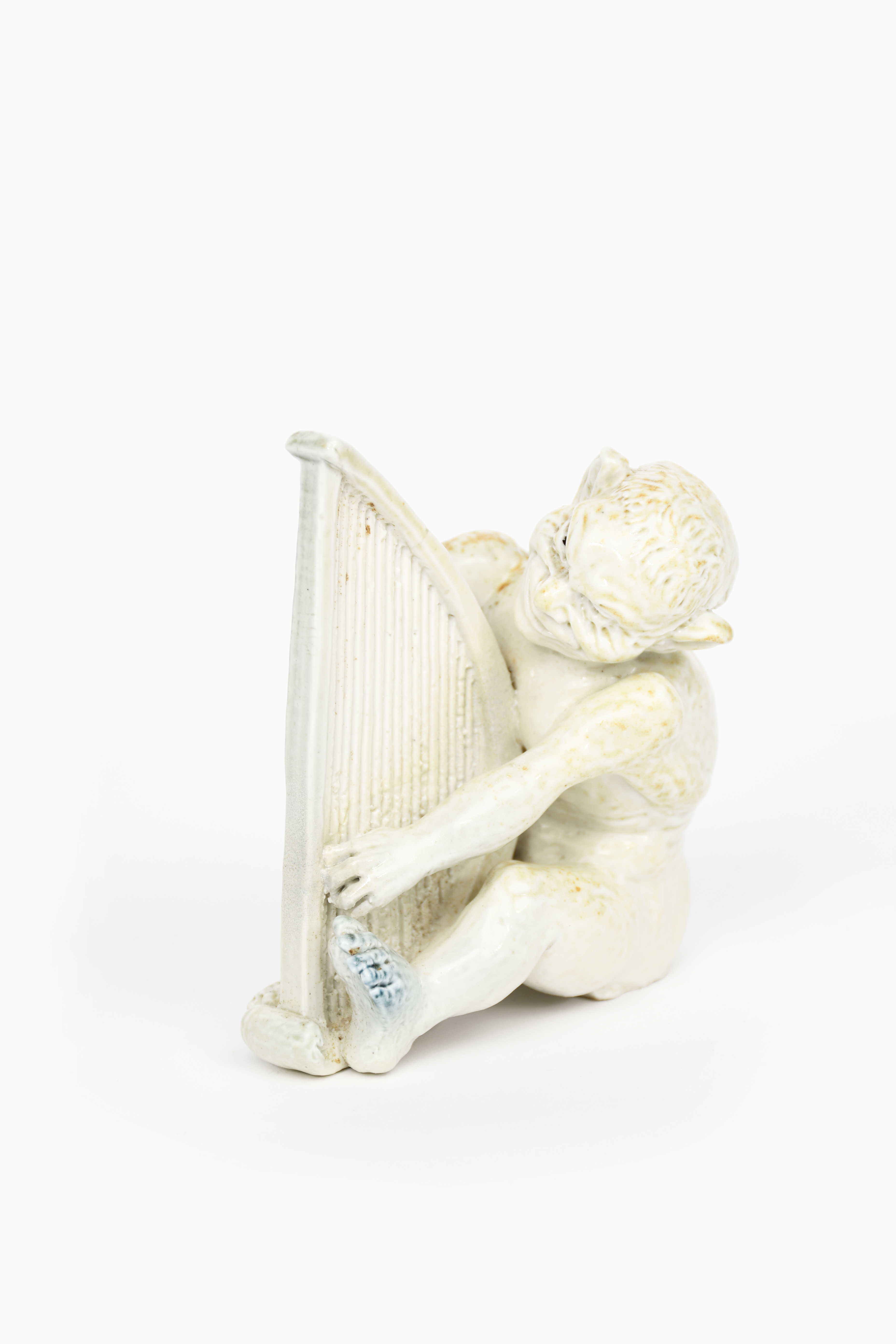 A Martin Brothers Pottery stoneware Imp Musician by Robert Wallace Martin, modelled seated playing the harp, covered in a white glaze with buff mottling, incised Martin London & Southall to harp, professional restoration to harp, 11.5cm. high