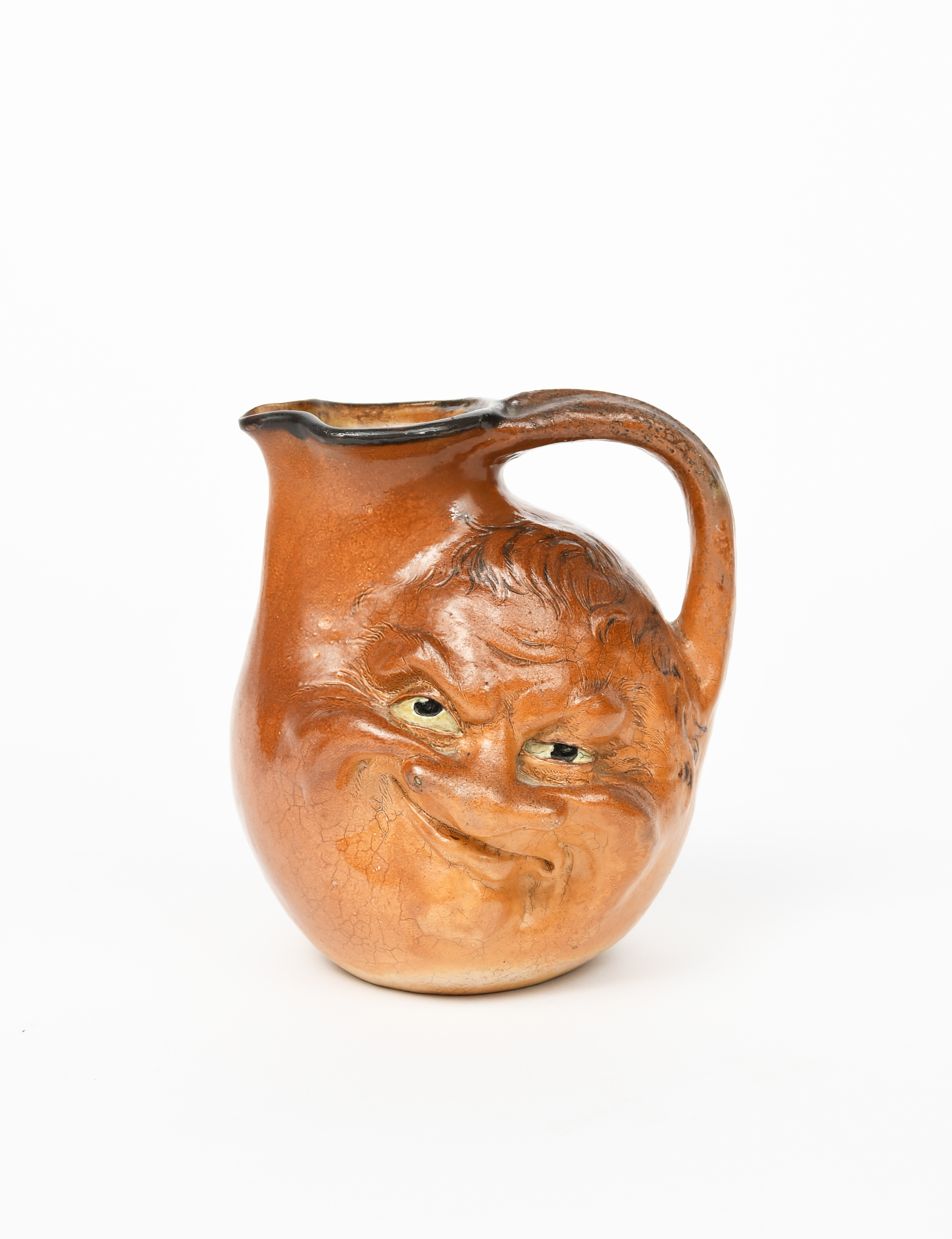 A Martin Brothers salt-glaze stoneware face jug by Robert Wallace Martin, dated 1899, modelled in relief to one side with a smiling, smirky grin, the reverse with a simple smile, glazed tan and ochre, highlighted with white and black, incised 5-1899 Martin Bros, London & Southall, professional restoration to top rim, 19.5cm. high