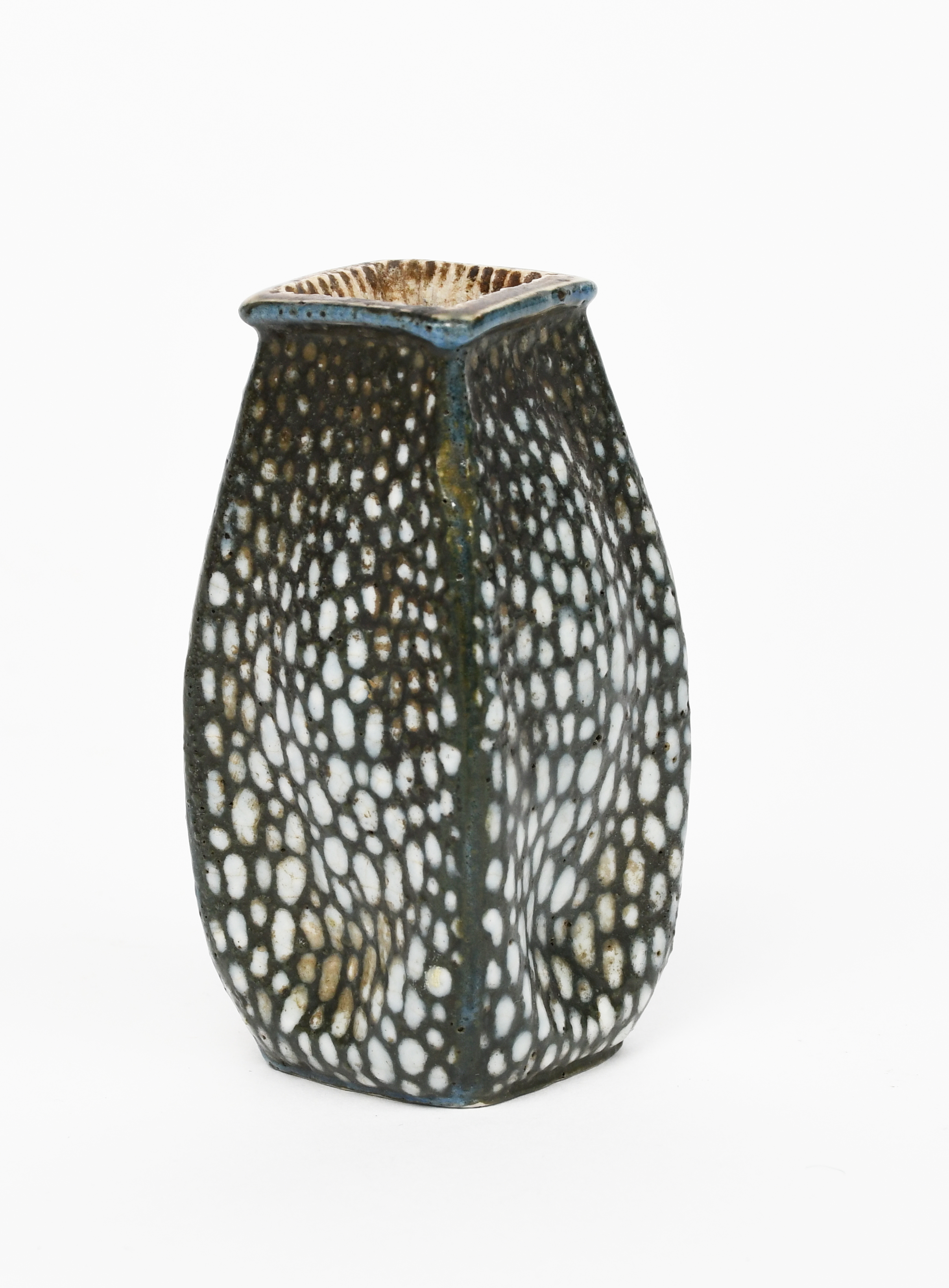 A Martin Brothers stoneware gourd vase by Edwin and Walter Martin, dated 1900, shouldered, square section, painted with white spots on a green ground, incised 1900 Martin Bros, London & Southall, 9.2cm. high