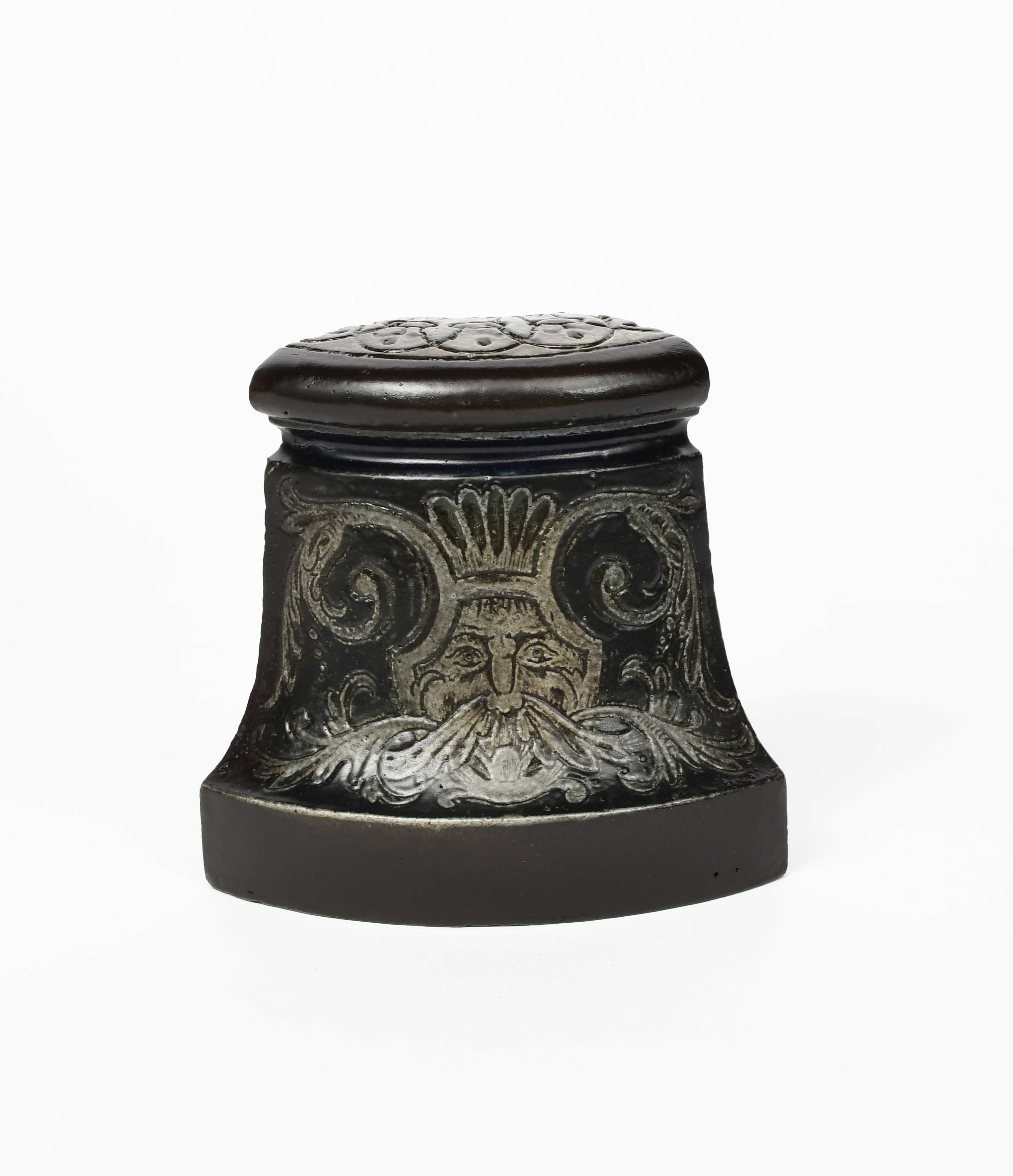A Martin Brothers stoneware kerb corner stone, incised with a shield mask with scrolling foliage, glazed brown and grey, unsigned, 13.5cm. high