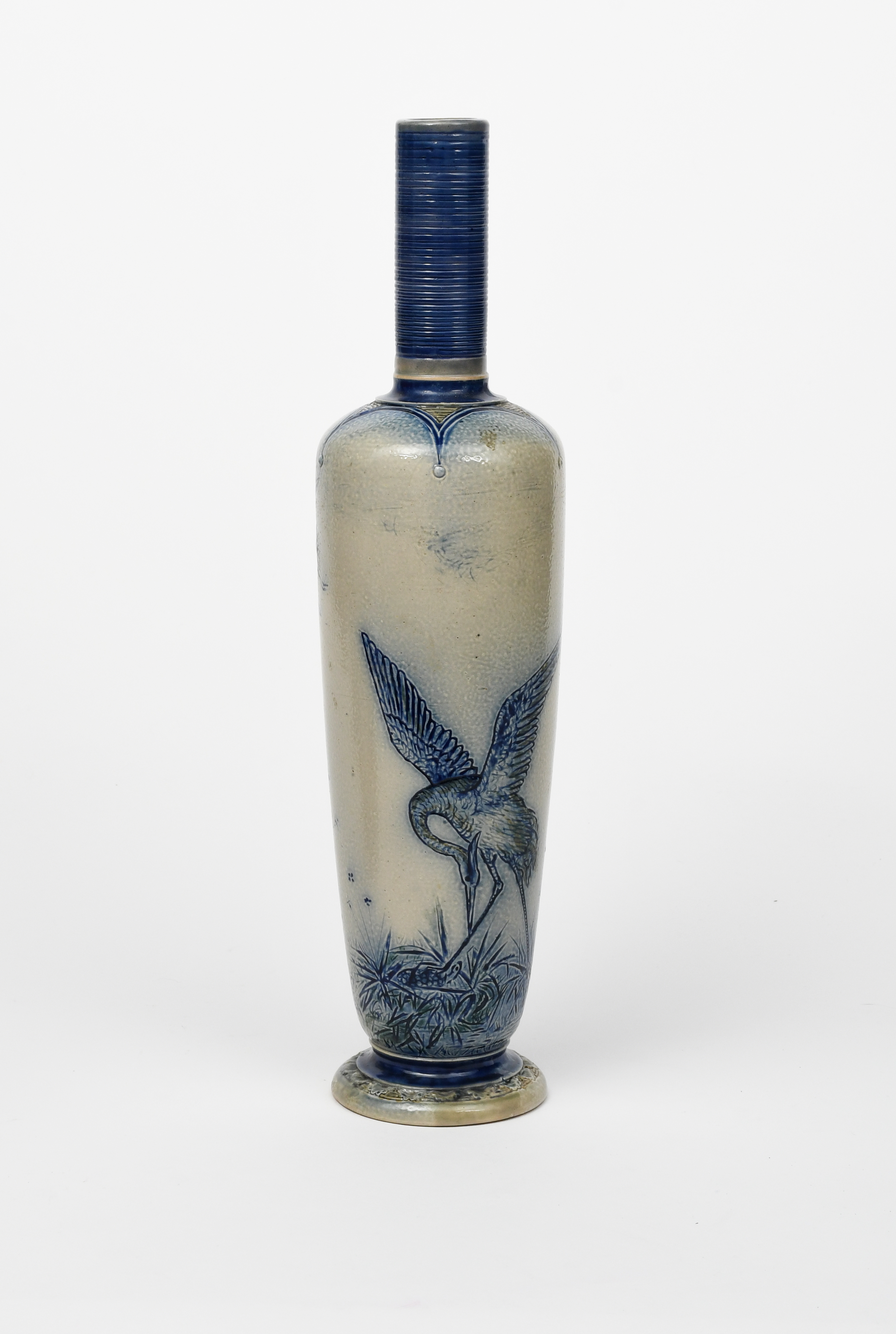 An early Martin Brothers stoneware vase by Robert Wallace Martin, dated 1873, slender, shouldered form, incised with a crane trapping a tortoise under its foot, amongst foliage, the reverse with a fruiting apple tree and two cranes flying, incised 10 R W Martin Southall, 3-1873, restored, 44.5cm. high