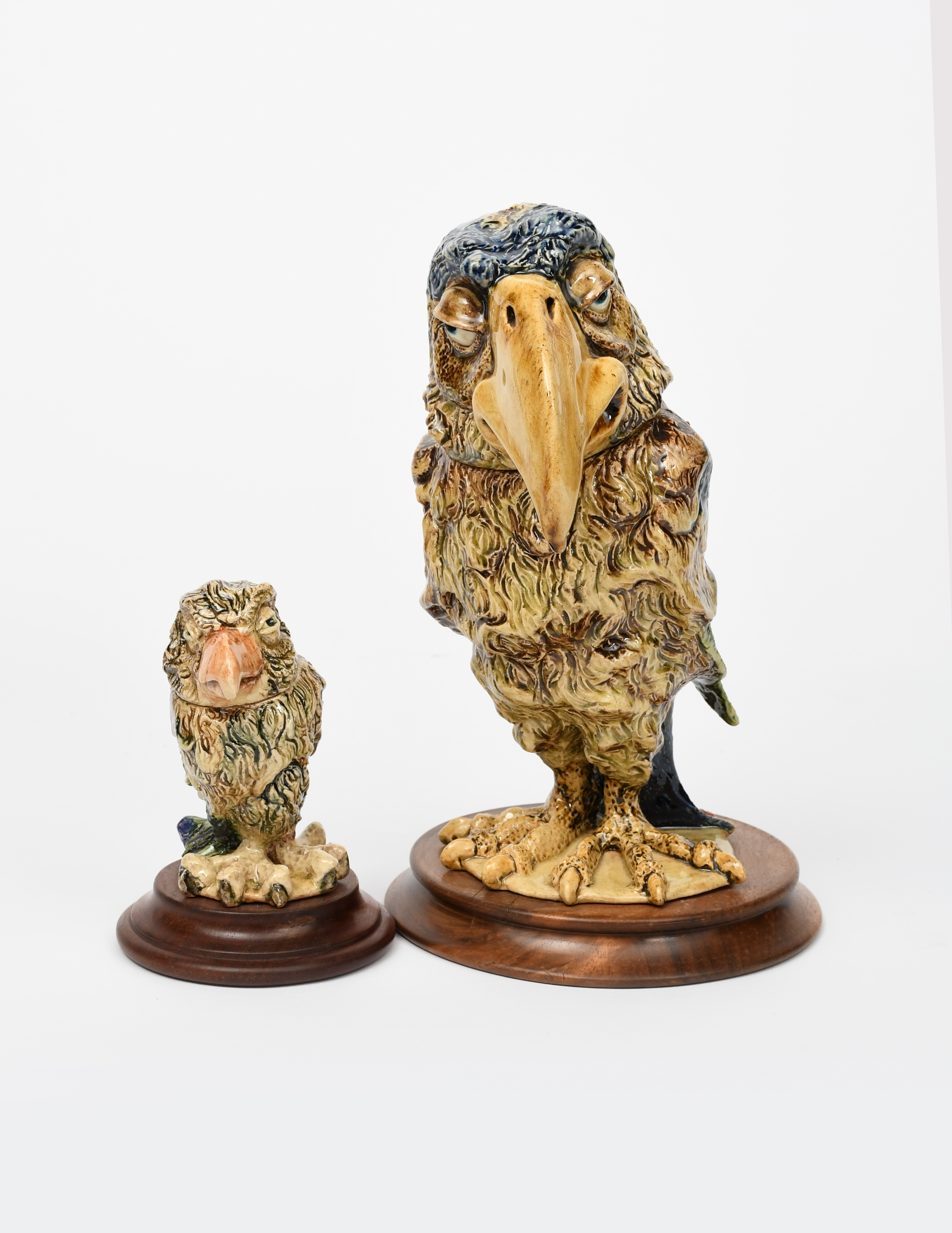 A bird jar and cover by Ben Sharp, Rye, modelled standing with slender claw feet, portly bird with hooked beak and knowing look, glazed tan and blue with green highlights, on wooden base, and another smaller bird jar and cover by Ben Sharp, incised marks, 29.5cm. high (4)