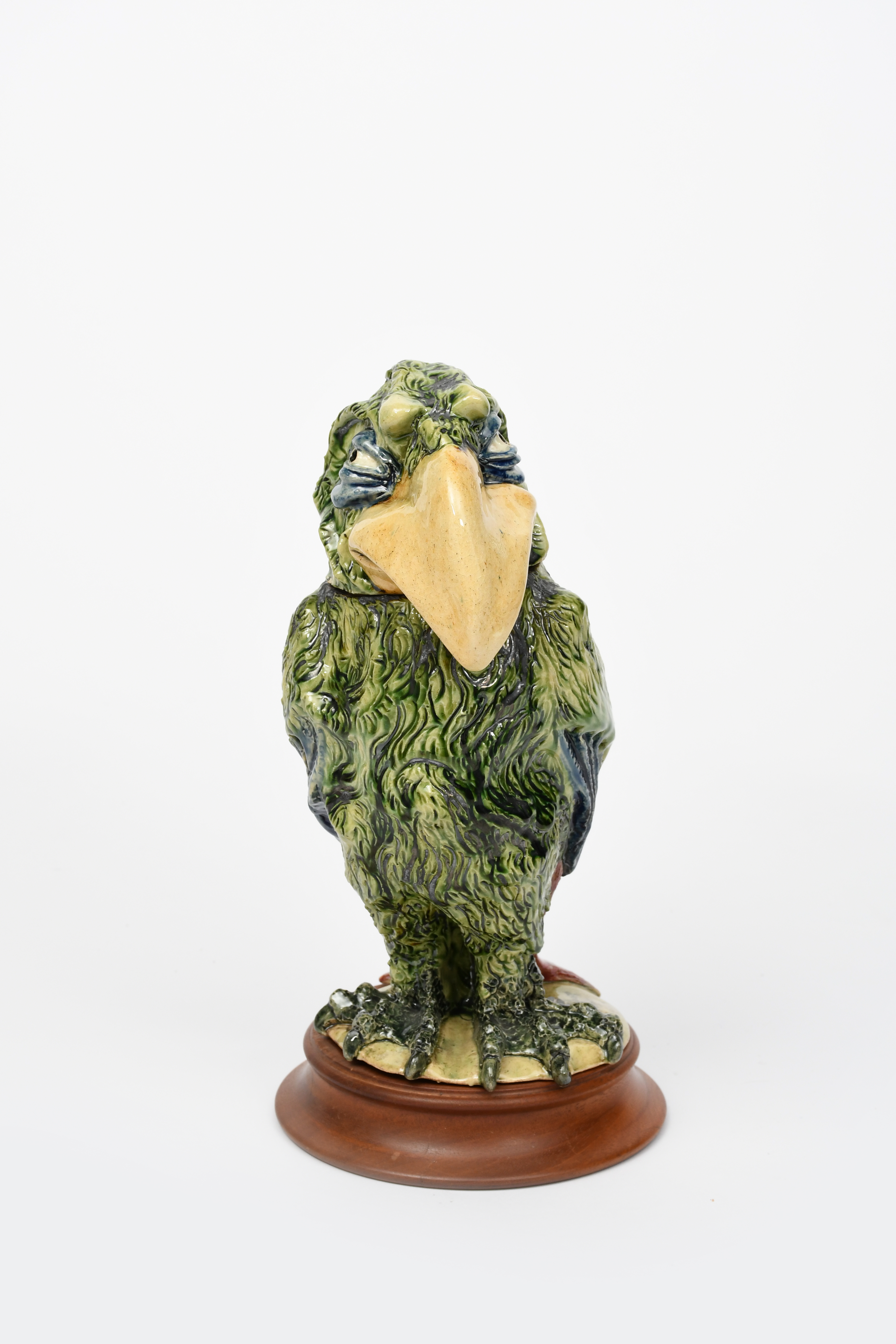 A bird jar and cover by Ben Sharp, Rye, modelled standing on webbed claw feet, the portly bird with wings tucked in, and broad hooked beak, glazed green, blue and tan with red tail feathers, on wooden base, incised marks, 32.5cm. high (2)