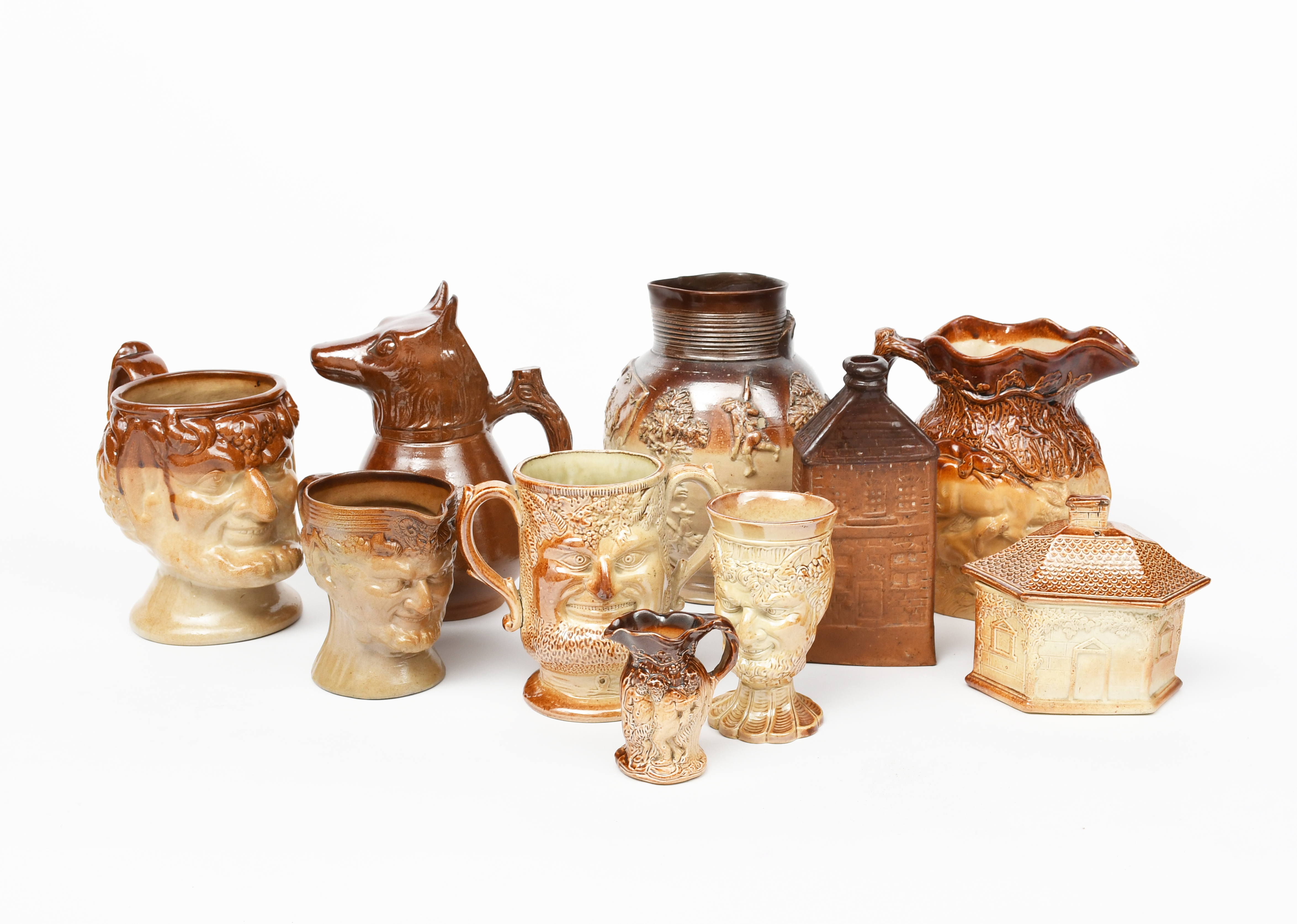 Two graduated salt glaze stoneware Bacchus jugs, modelled as satyr heads, two salt glaze Bacchus mugs, a salt glaze cottage pot and cover, a flask, a bear jug and three other salt glaze jugs, unsigned, 17cm. high (tallest), (11)