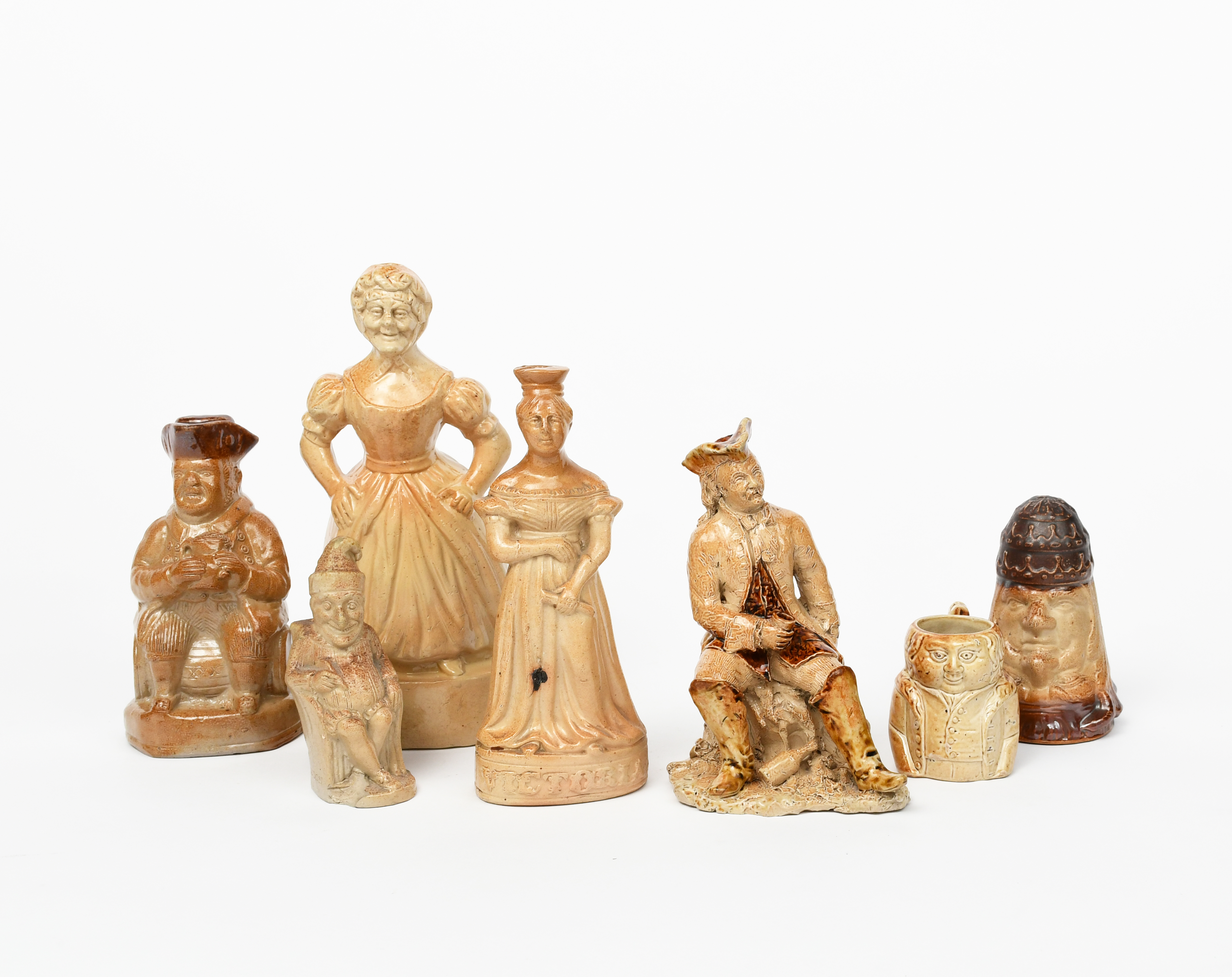 A Joseph Green Lambeth salt-glaze stoneware Victoria flask, 1837, a salt-glaze stoneware marriage cup, a stoneware figure of a man in tricorn hat seated and drinking, a Gardeners ink work salt glaze stoneware Mr Punch ink pot, and three other salt-glaze stoneware figural pieces, incised mark to base, 21cm. high (7)