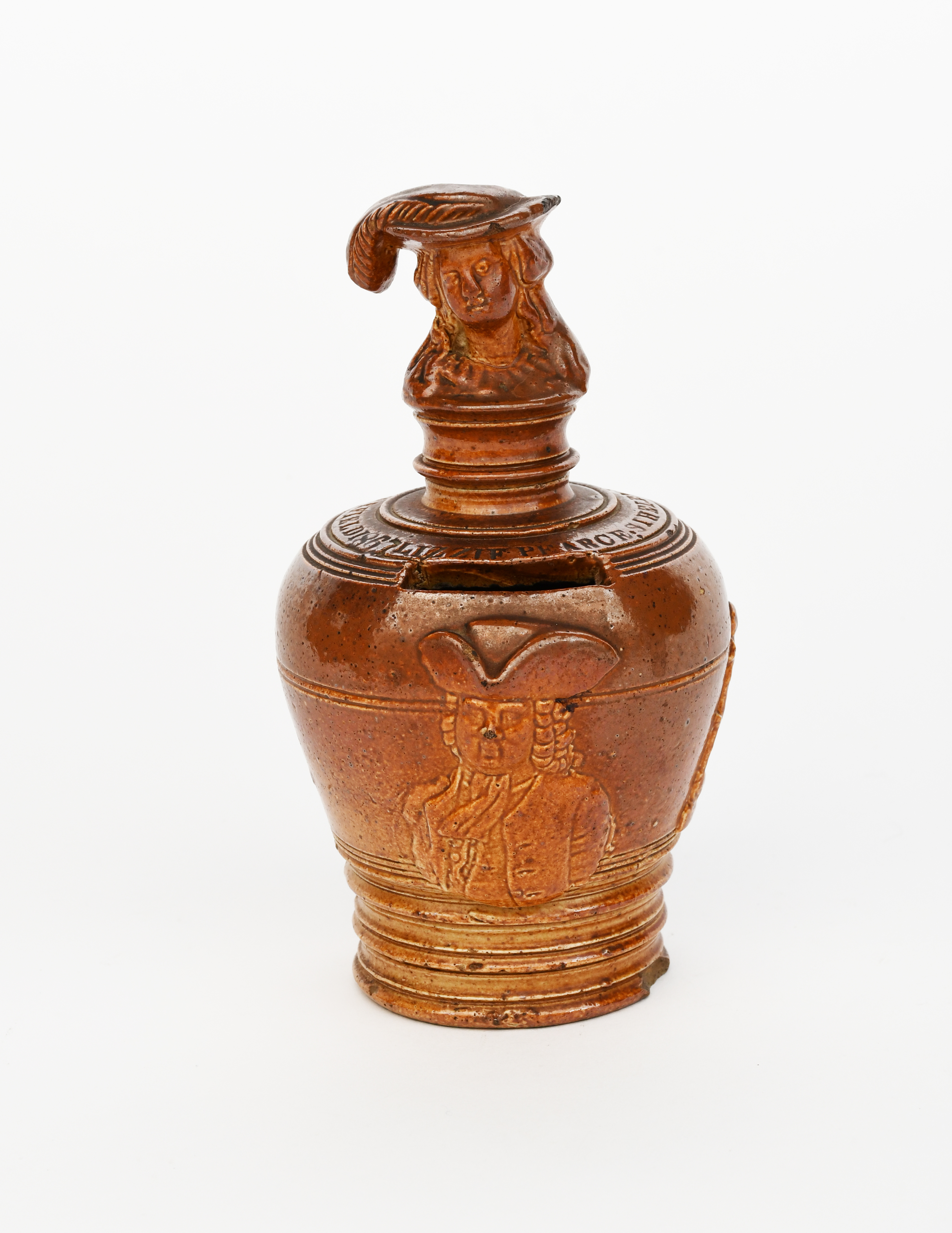 A salt-glaze stoneware money box dated 1867, ovoid with portrait panel, the cover with a bust of a
