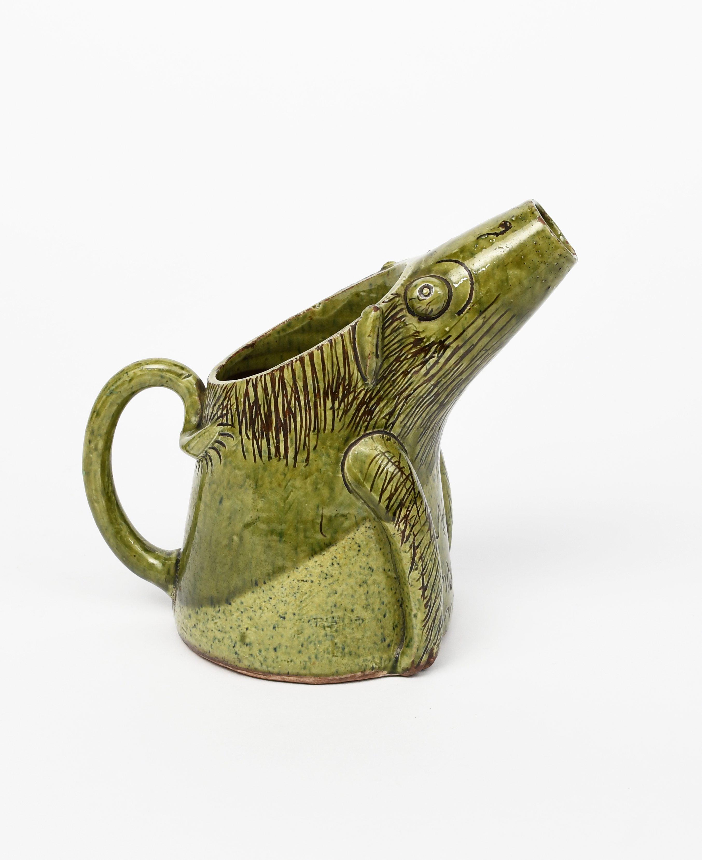 A Ewenny Pottery Wild Pig jug probably by Horace Elliott, tapering cylindrical body with conical snout spout, incised textured body inscribed Y Mochyn Gwyltt, (the wild pig), glazed green, incised Ewenny Pottery 1910 to base, 19.5cm. high