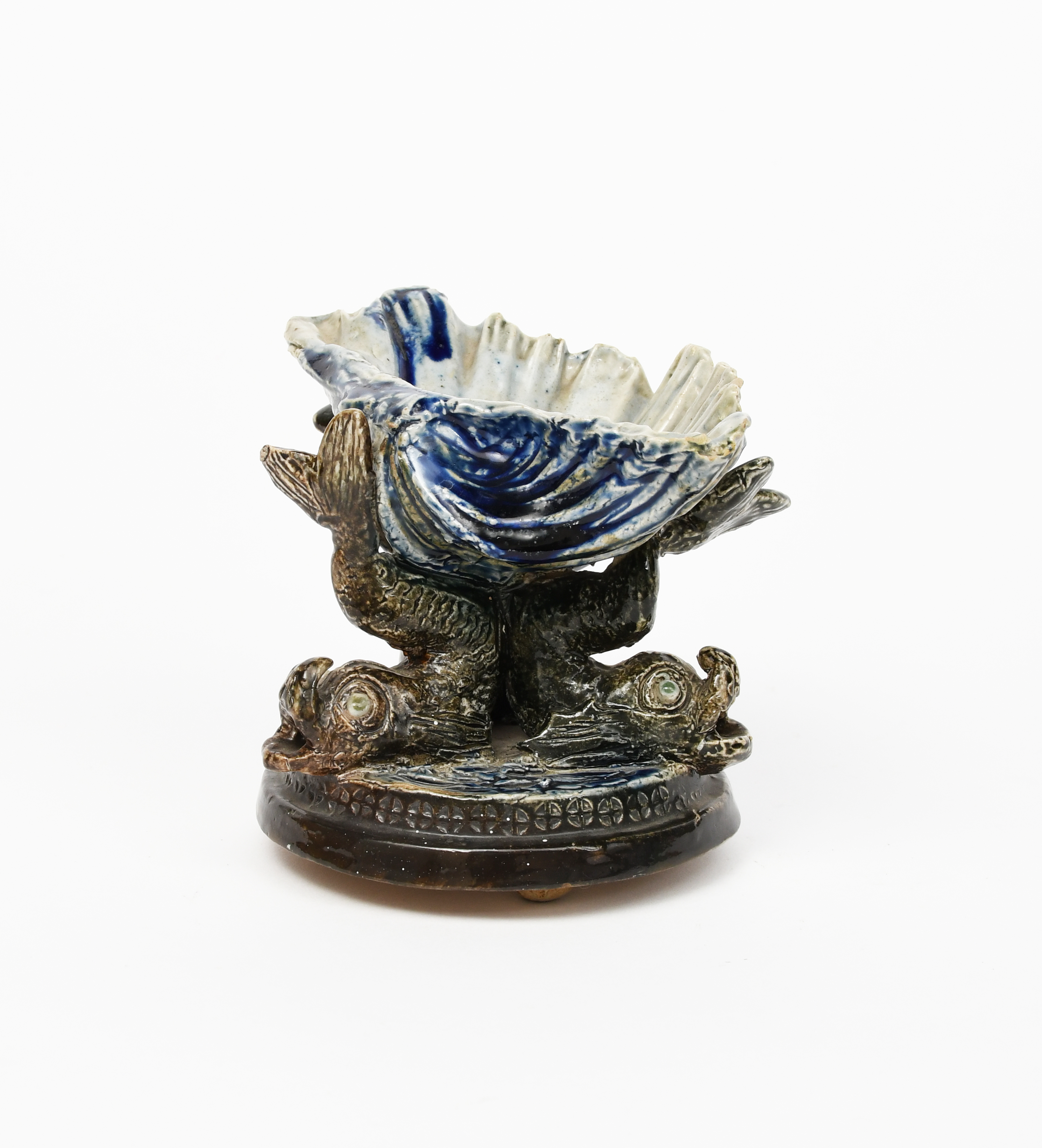 An unusual small stoneware tazza by George Hugo Tabor, possibly made at Fulham, modelled as three fish, their tales supporting a large shell, glazed blue and brown, incised G H Tabor signature to base, restored, 11cm. high