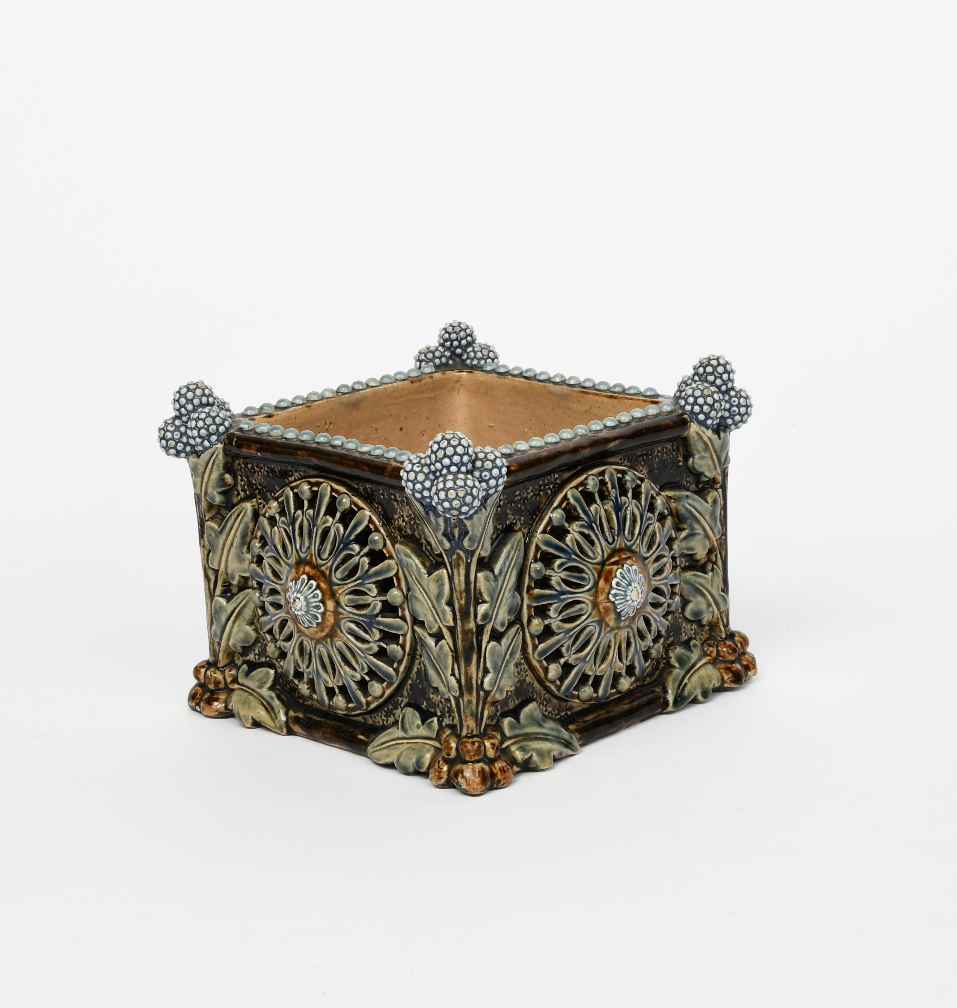 A Doulton Lambeth stoneware jardiniere, dated 1877, square section, modelled in relief with flower roundels, the corners modelled in relief with flower stems, in green, blue and brown, impressed marks to interior, minor losses, 16.5cm. high