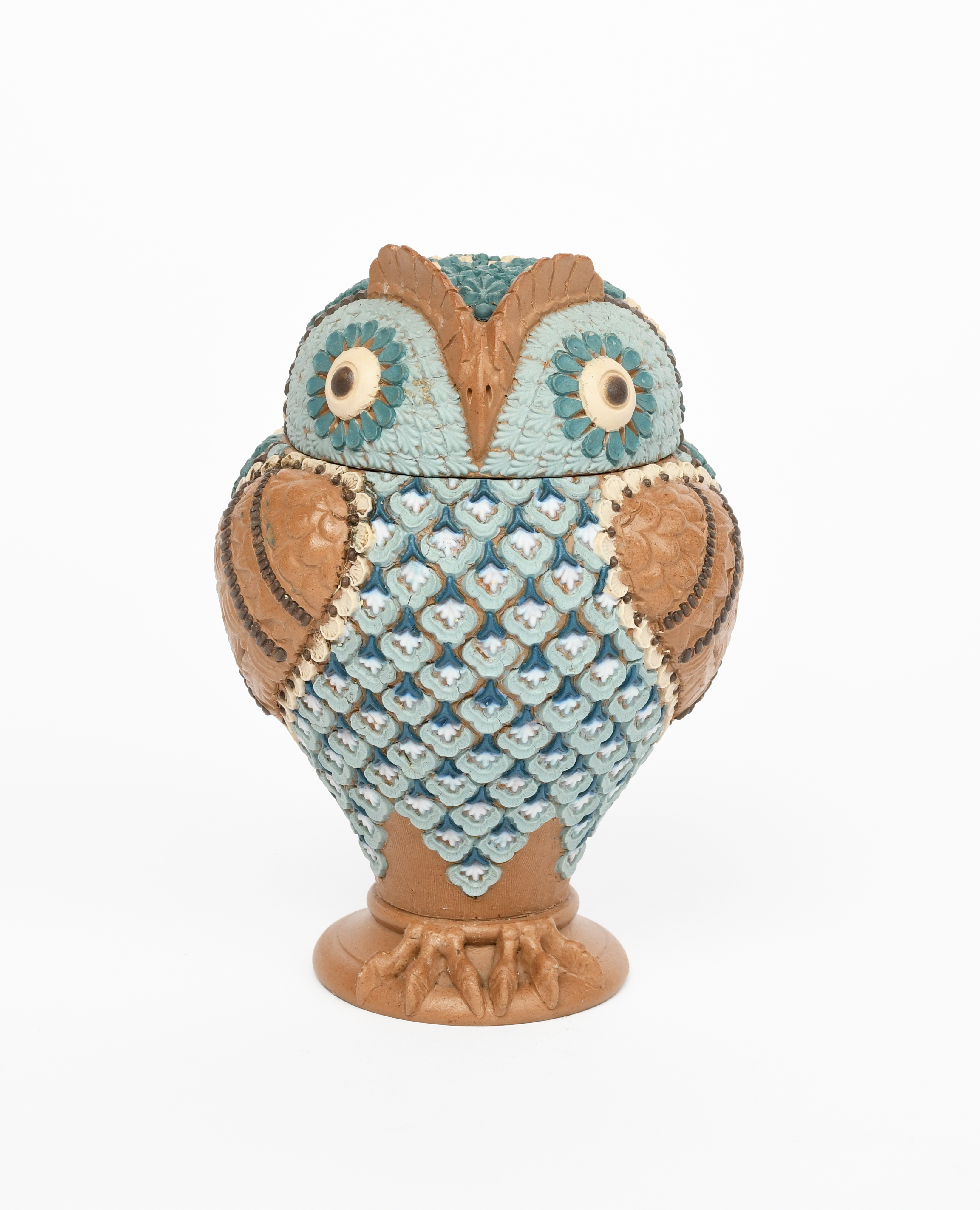 A Doulton Lambeth Silicon Ware owl jar and cover, the standing bird with applied blue and white feathers, impressed factory marks, 19cm. high (2)
