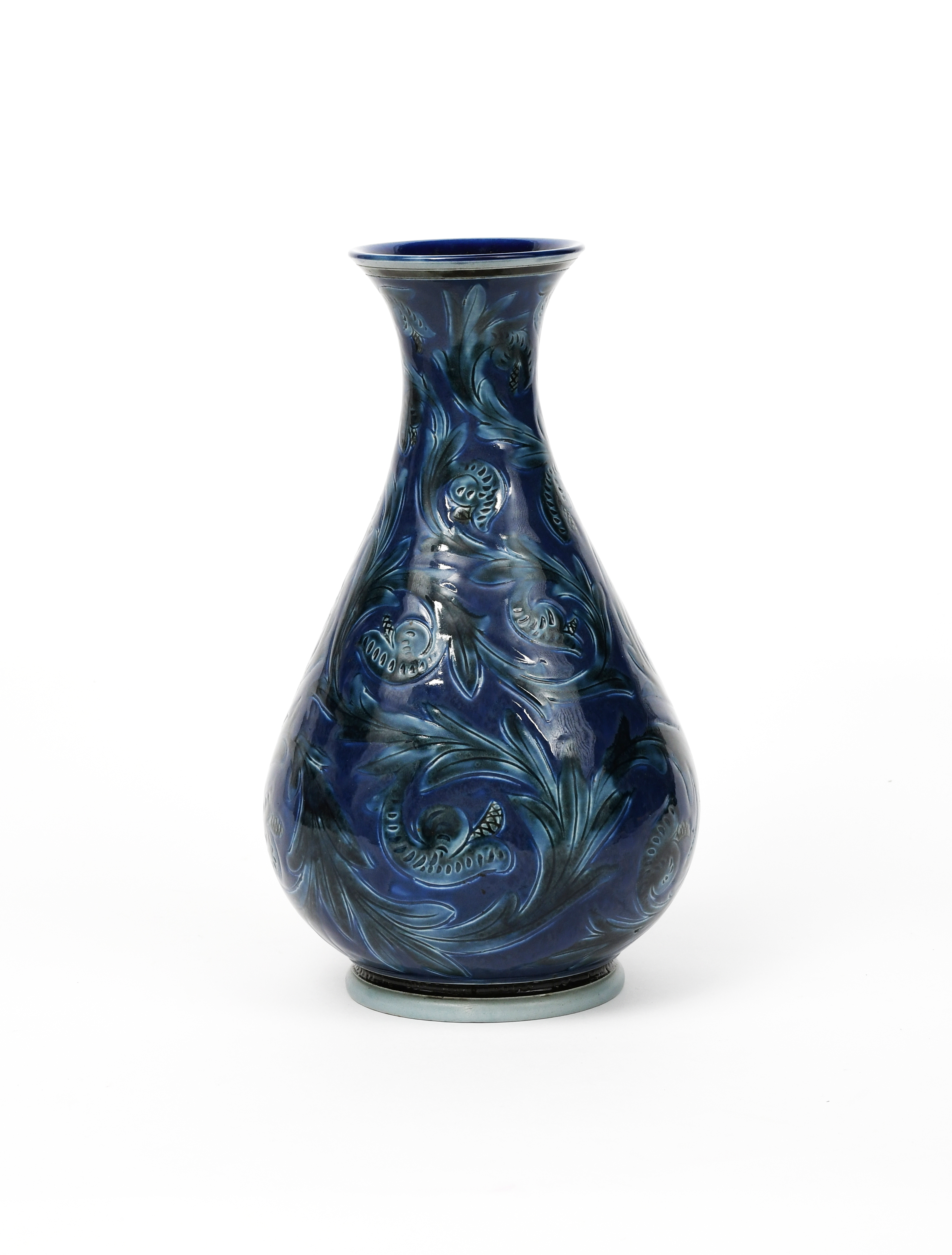 A Doulton Lambeth stoneware vase by Arthur Barlow, dated 1874, pear-shaped with flaring rim, incised with scrolling foliage in shades of blue on a blue ground, impressed marks, incised monogram, 29cm. high