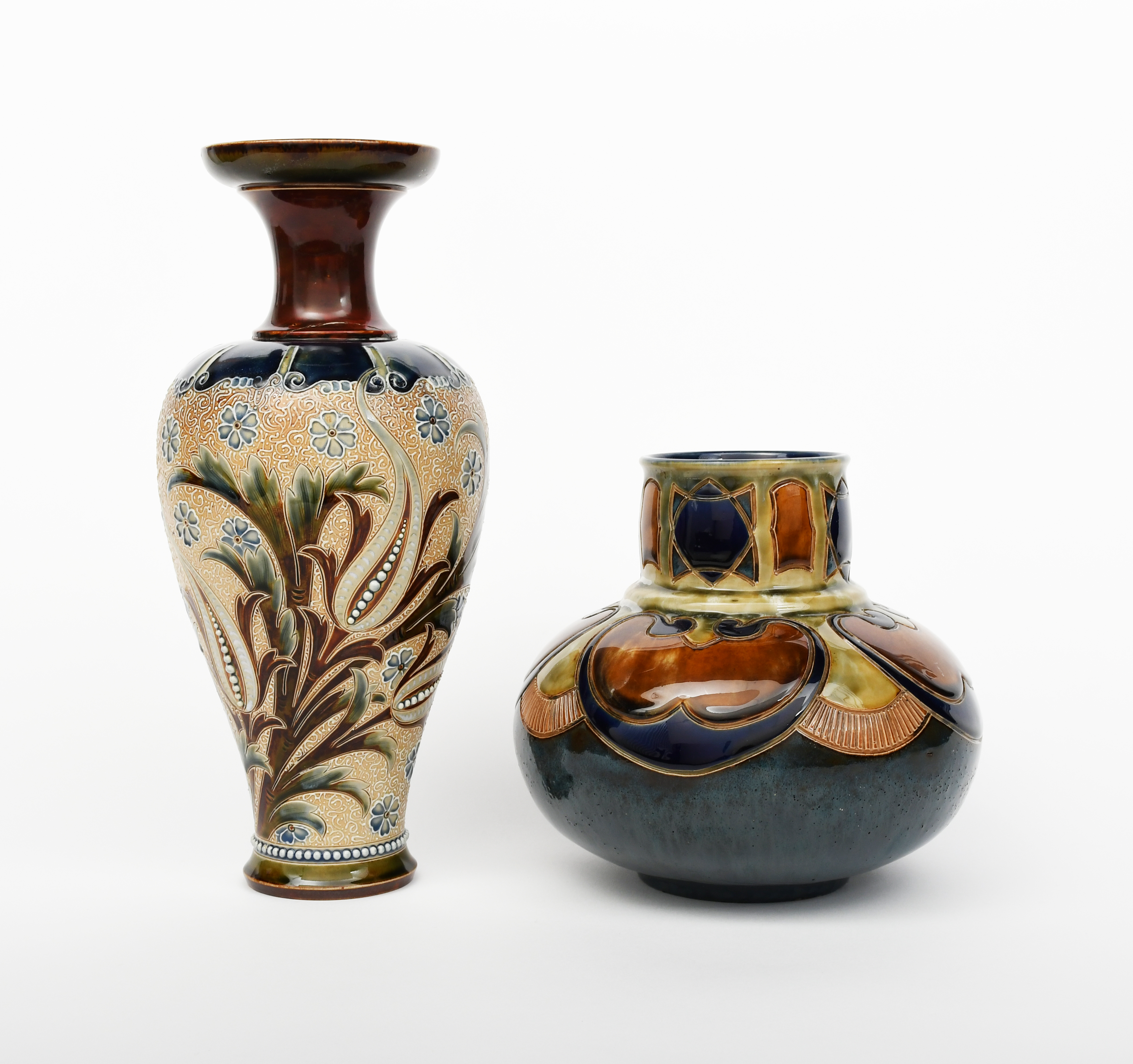 An Art Nouveau Doulton Lambeth stoneware vase by Eliza Simmance, made of the Art Union of London, slender baluster form, incised with Art Nouveau flower and foliage, glazed in shades of green, brown and blue on a buff ground, with white slip textured decoration, and a Doulton vase by Frank Butler impressed marks, incised monograms, restored, 34cm. high (2)
