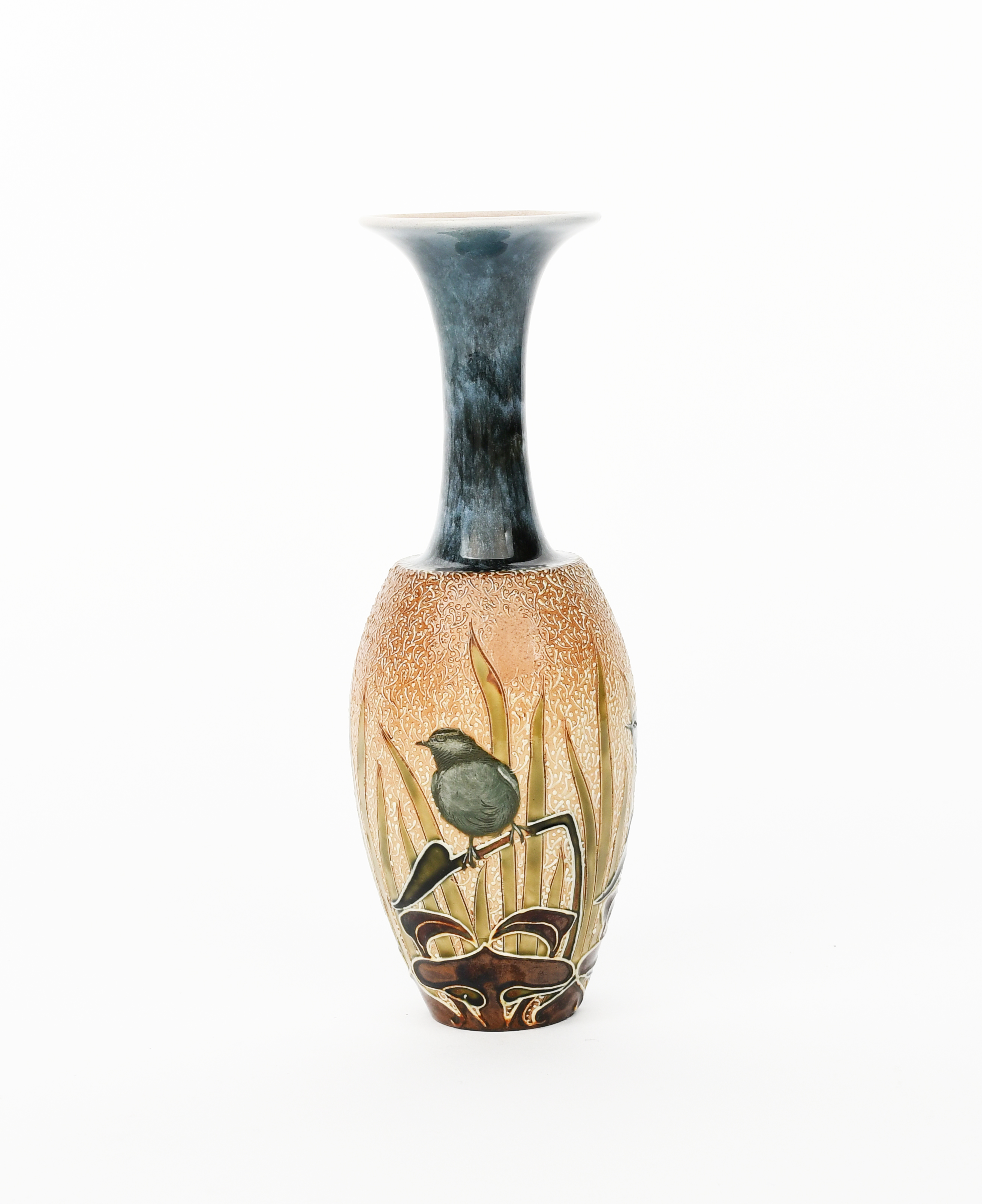 A Doulton Lambeth stoneware vase by Florence Barlow, shouldered form with cylindrical neck and flaring rim, pate sur pate decorated with birds perched on Art Nouveau foliage stems before a backdrop of reeds, in shades of green, white and brown on a textured slip ground, impressed factory marks, incised monogram, professionally restored neck, 23.5cm. high