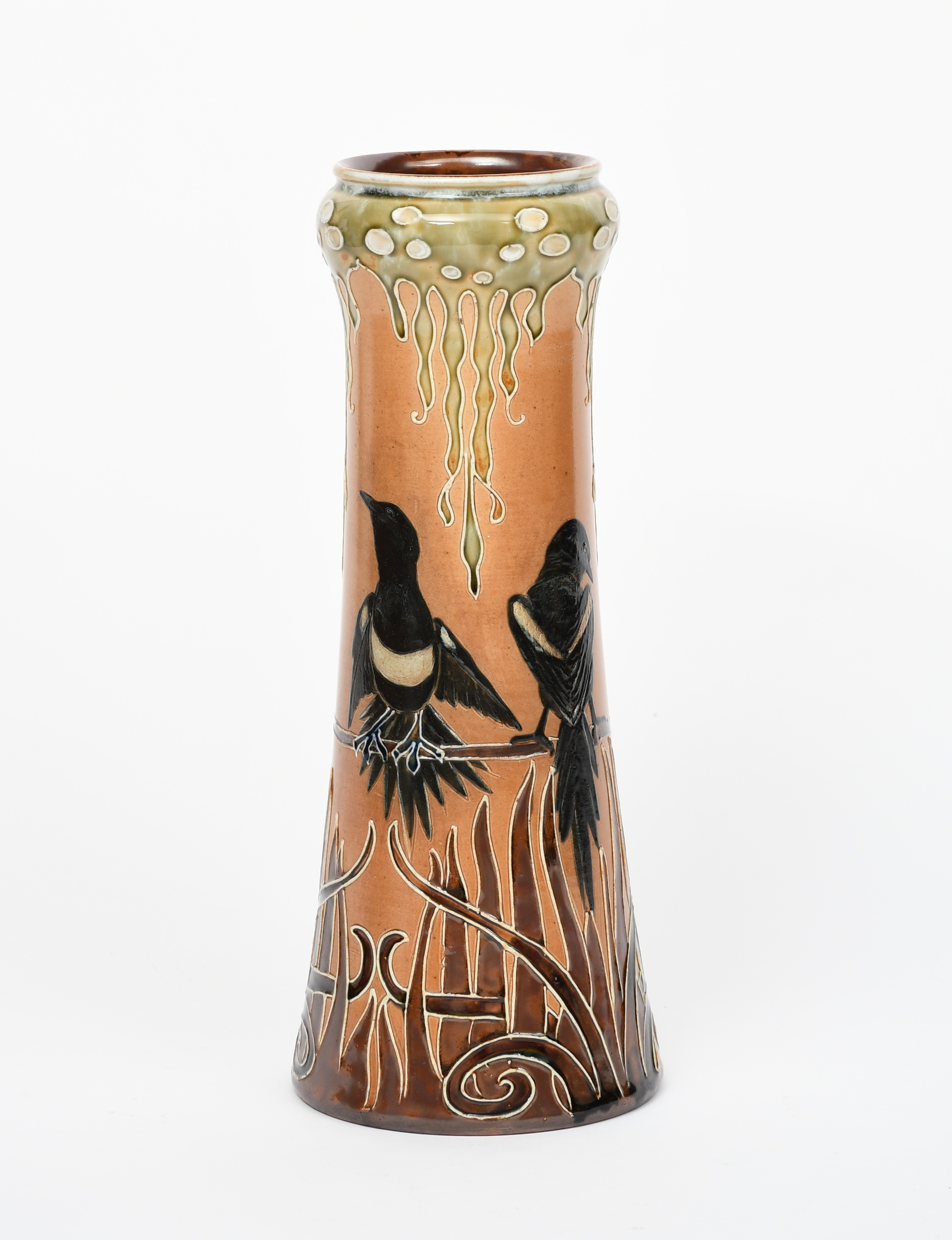 A rare Royal Doulton stoneware vase by Florence Barlow, waisted cylindrical form, pate sur pate decorated with magpies perched on a bough, between tubelined Art Nouveau foliate borders, in colours on a buff ground, impressed factory marks, incised monogram, 32.5cm. high