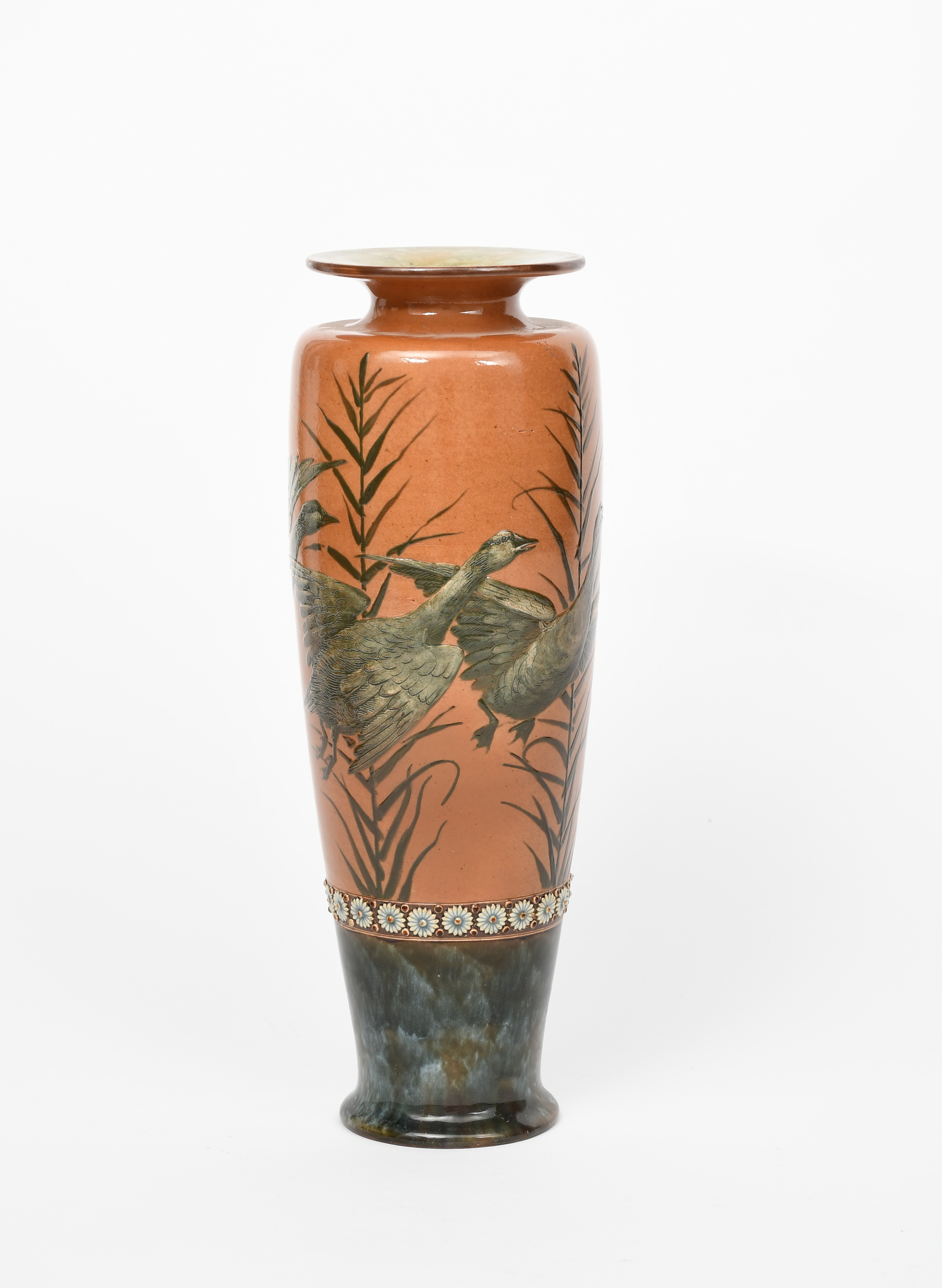A Royal Doulton stoneware vase by Florence Barlow, shouldered form, pate sur pate decorated with geese flying past reeds, in green and white, above a band of applied florets and mottled green and blue foot, impressed factory marks, incised monogram, professional restoration to rims, 36cm. high